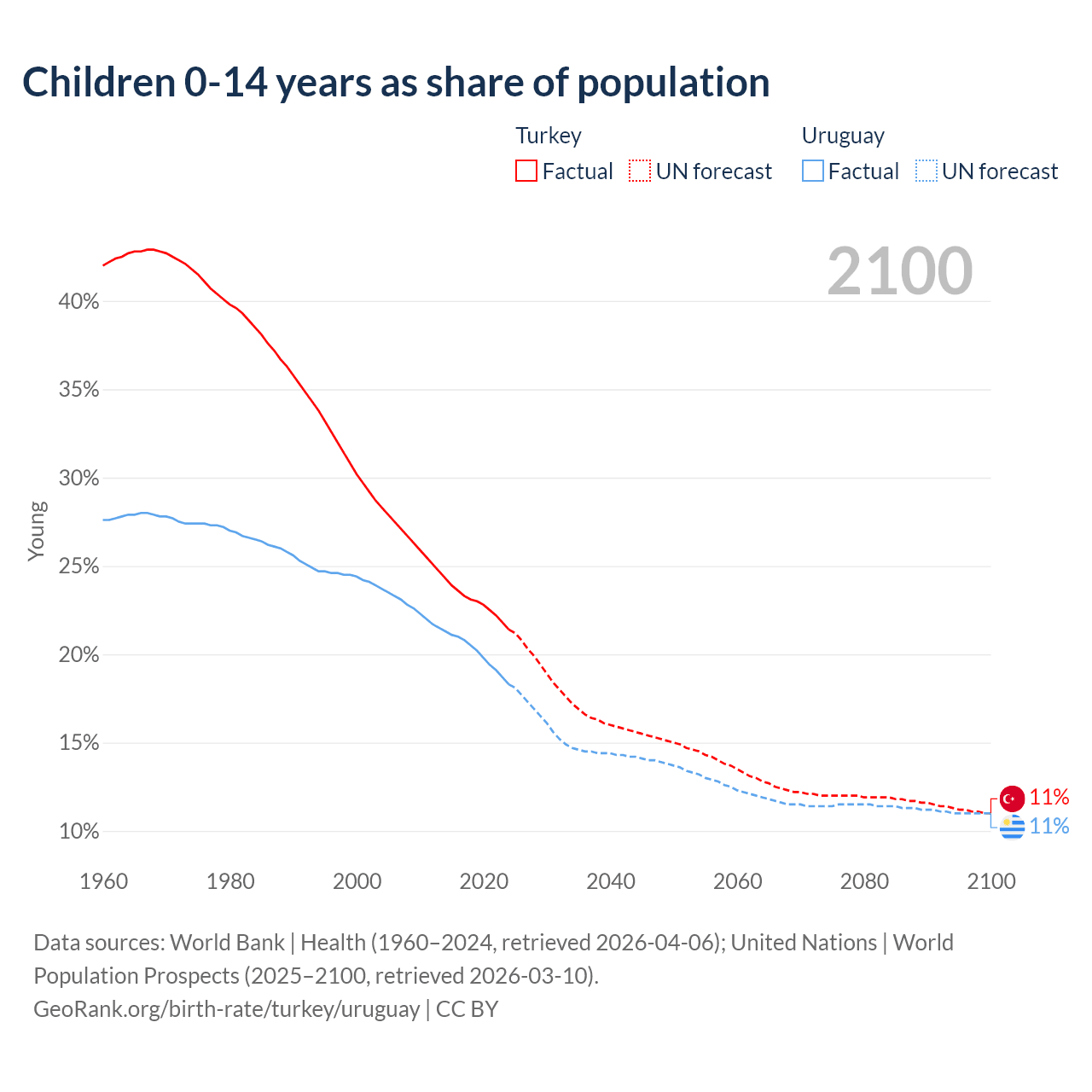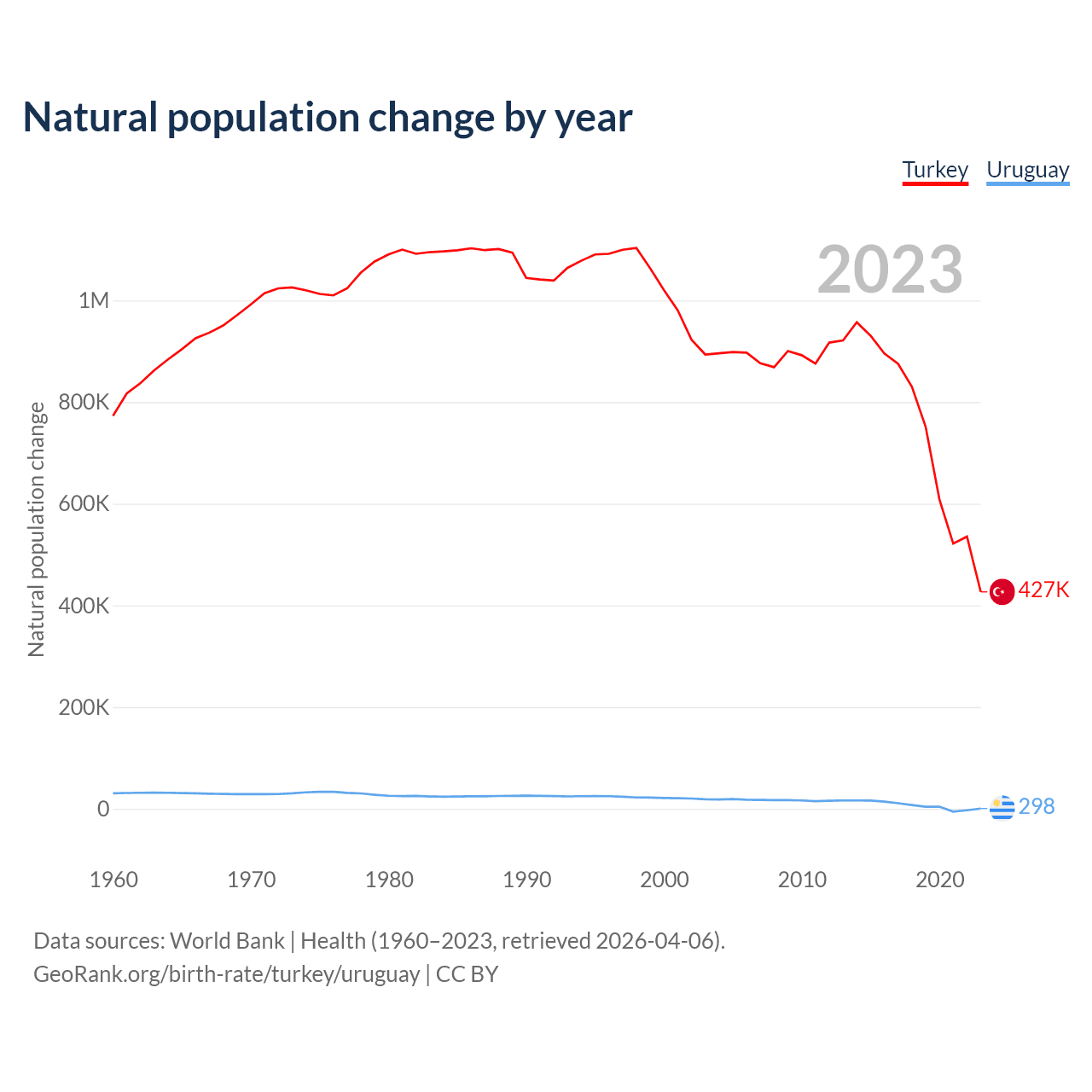 According to the latest available data on birth rates, the fertility rate in Turkey was 1.51 children per woman in 2023, compared to 1.41 in Uruguay in 2023. The replacement level is considered to be 2.1 children per woman.