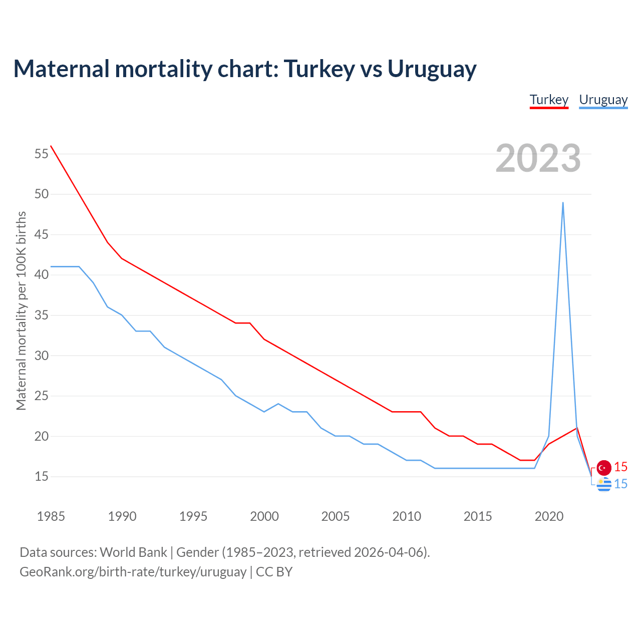 The maternal mortality rate, which is the probability of dying during childbirth or within 42 days of pregnancy termination, is 15 deaths per 100,000 live births in Turkey, compared to 15 deaths in Uruguay.