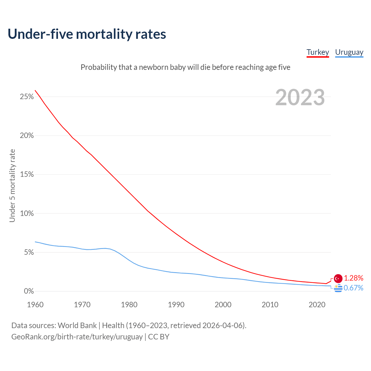 The chance that a newborn baby will die before reaching age five is 1.28% in Turkey and 0.67% in Uruguay. Above is a chart with historical data on under-five mortality rates.