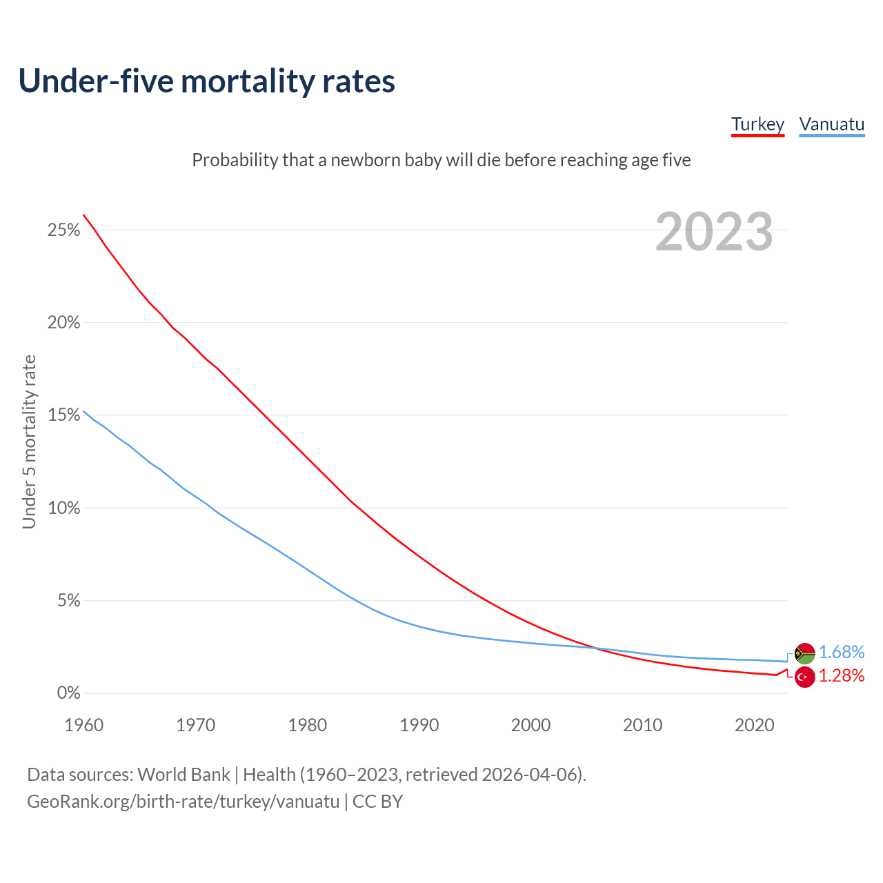 The chance that a newborn baby will die before reaching age five is 1.28% in Turkey and 1.68% in Vanuatu. Above is a chart with historical data on under-five mortality rates.