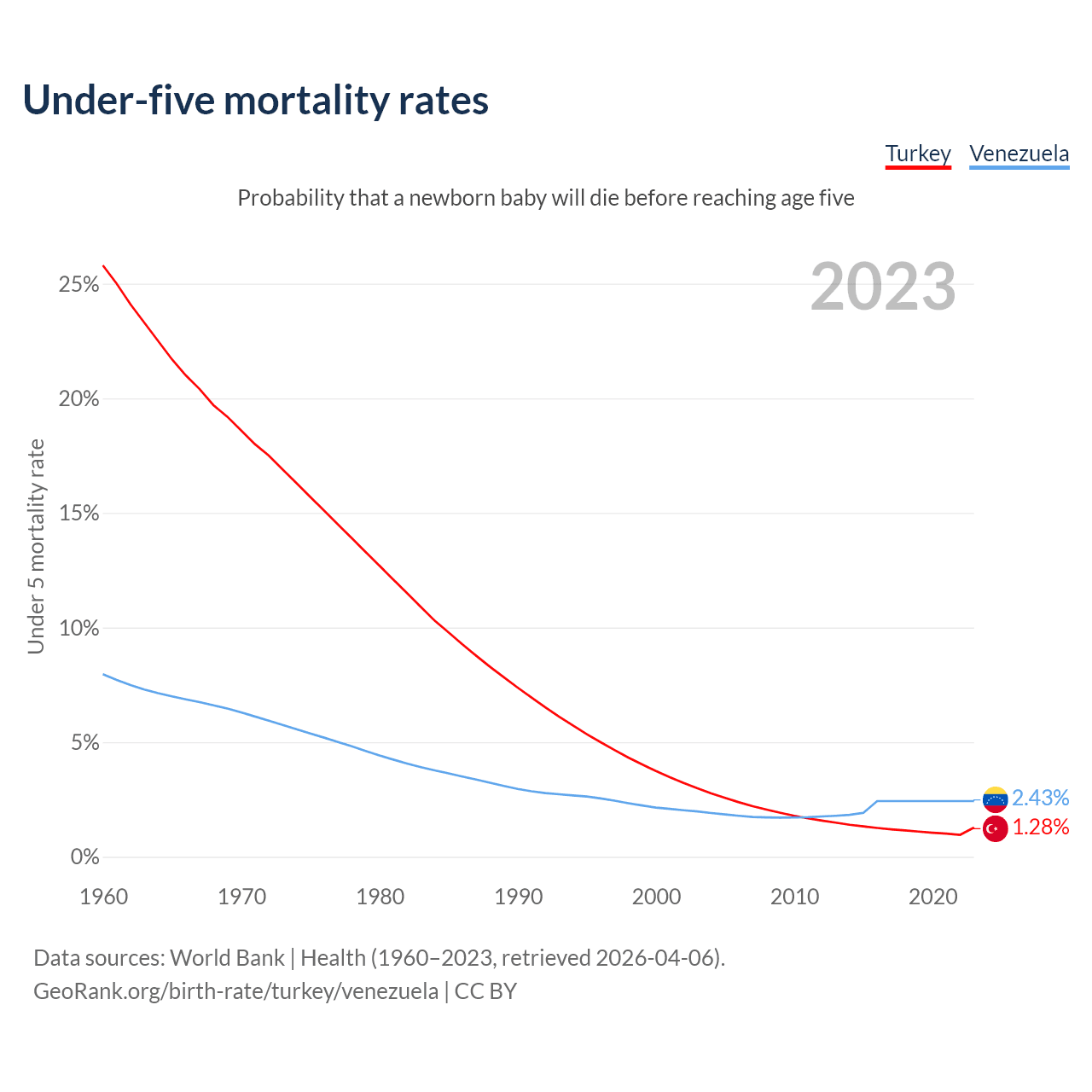 The chance that a newborn baby will die before reaching age five is 1.28% in Turkey and 2.43% in Venezuela. Above is a chart with historical data on under-five mortality rates.
