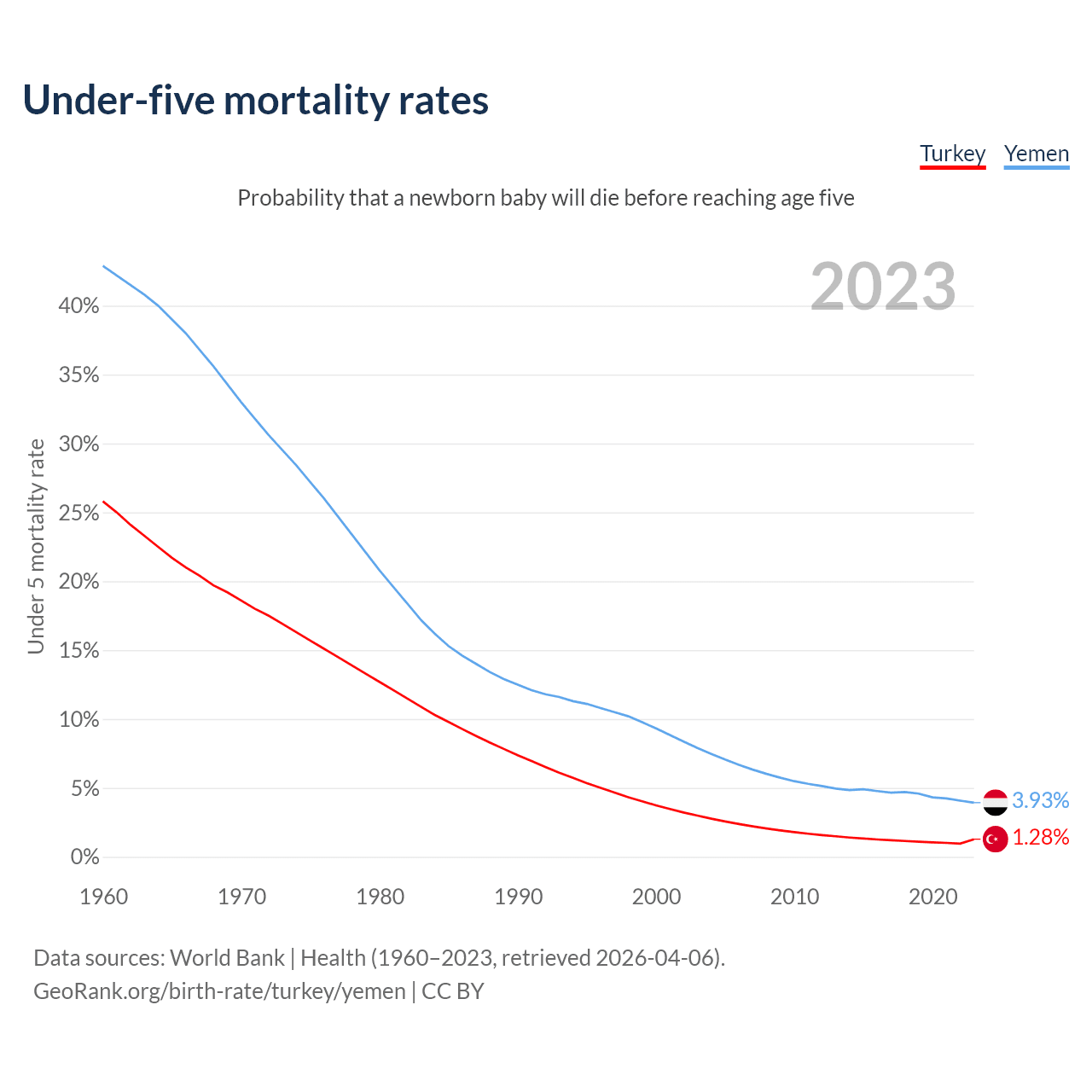 The chance that a newborn baby will die before reaching age five is 1.28% in Turkey and 3.93% in Yemen. Above is a chart with historical data on under-five mortality rates.