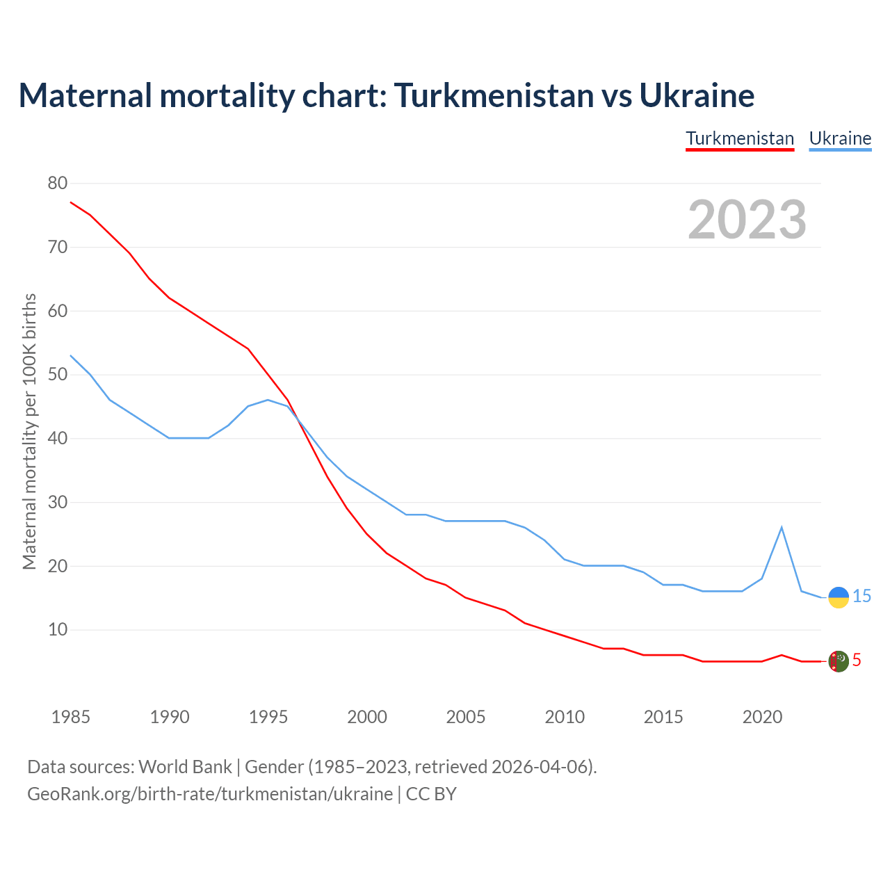 The maternal mortality rate, which is the probability of dying during childbirth or within 42 days of pregnancy termination, is 5 deaths per 100,000 live births in Turkmenistan, compared to 15 deaths in Ukraine.