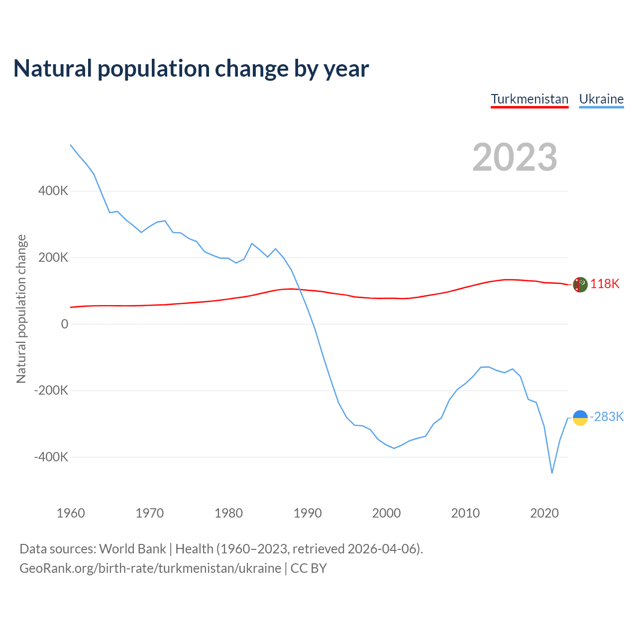 Turkmenistan has an annual birth rate of 21.7 births per 1,000 people, compared to 5.63 for Ukraine. The average number of children a woman is expected to have during her lifetime — the fertility rate, is 2.69 in Turkmenistan and 0.98 in Ukraine — 63.7% difference.