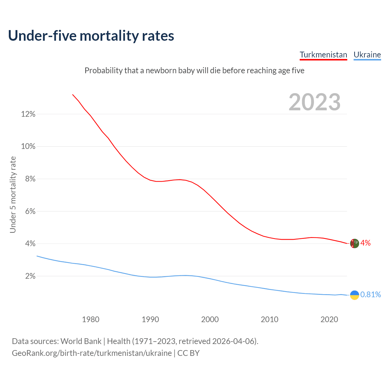The chance that a newborn baby will die before reaching age five is 4% in Turkmenistan and 0.81% in Ukraine. Above is a chart with historical data on under-five mortality rates.