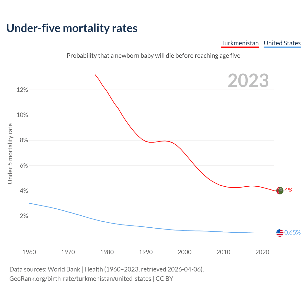 The chance that a newborn baby will die before reaching age five is 4% in Turkmenistan and 0.65% in the United States. Above is a chart with historical data on under-five mortality rates.
