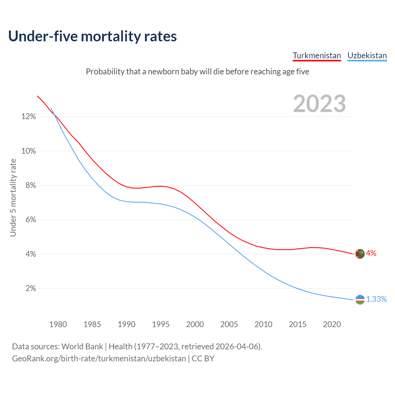 The chance that a newborn baby will die before reaching age five is 4% in Turkmenistan and 1.33% in Uzbekistan. Above is a chart with historical data on under-five mortality rates.