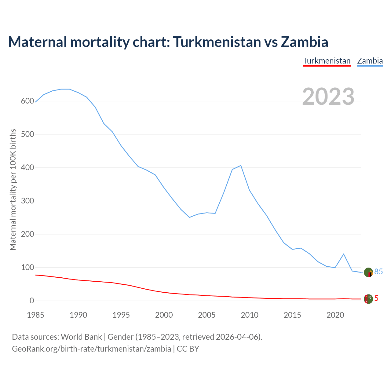 The maternal mortality rate, which is the probability of dying during childbirth or within 42 days of pregnancy termination, is 5 deaths per 100,000 live births in Turkmenistan, compared to 85 deaths in Zambia.