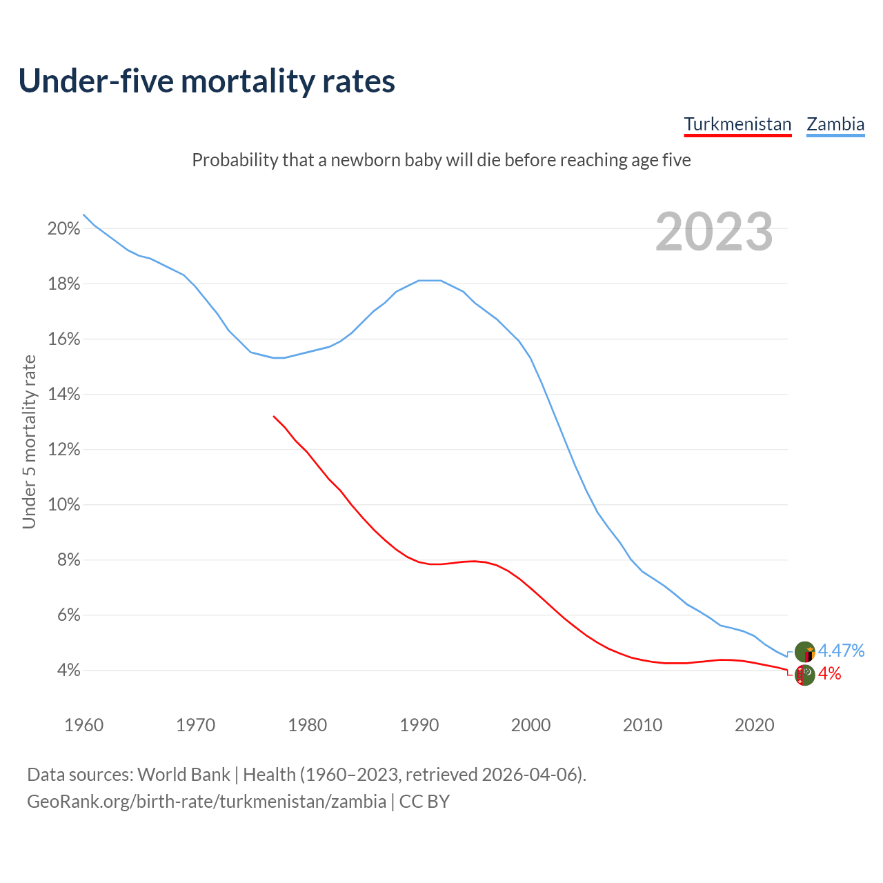 The chance that a newborn baby will die before reaching age five is 4% in Turkmenistan and 4.47% in Zambia. Above is a chart with historical data on under-five mortality rates.