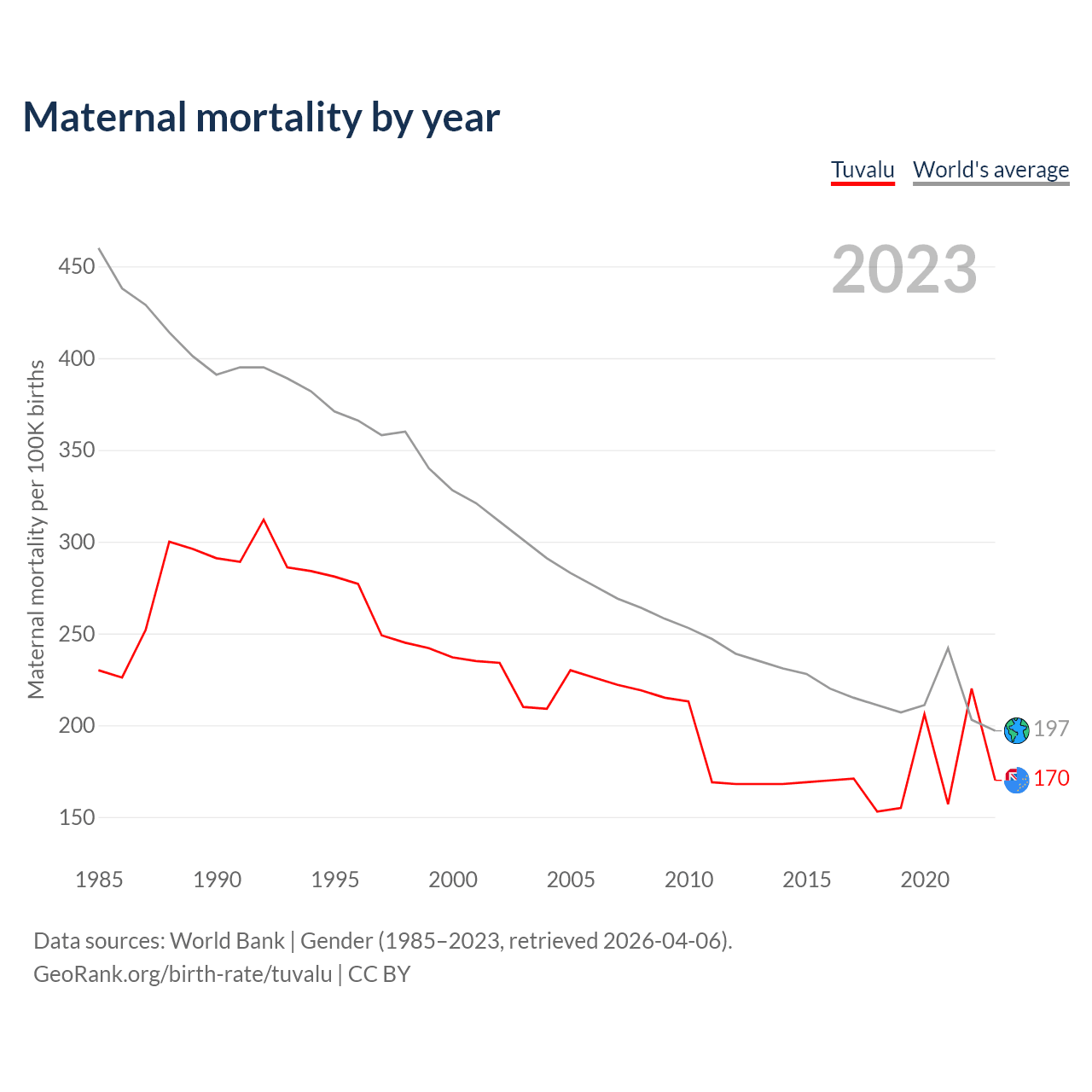 The maternal mortality rate in Tuvalu was 170 deaths per 100,000 live births in 2023 — a 0.17% chance of dying during childbirth or within 42 days of pregnancy termination. This is a 28.3% decrease compared to the year 2000.