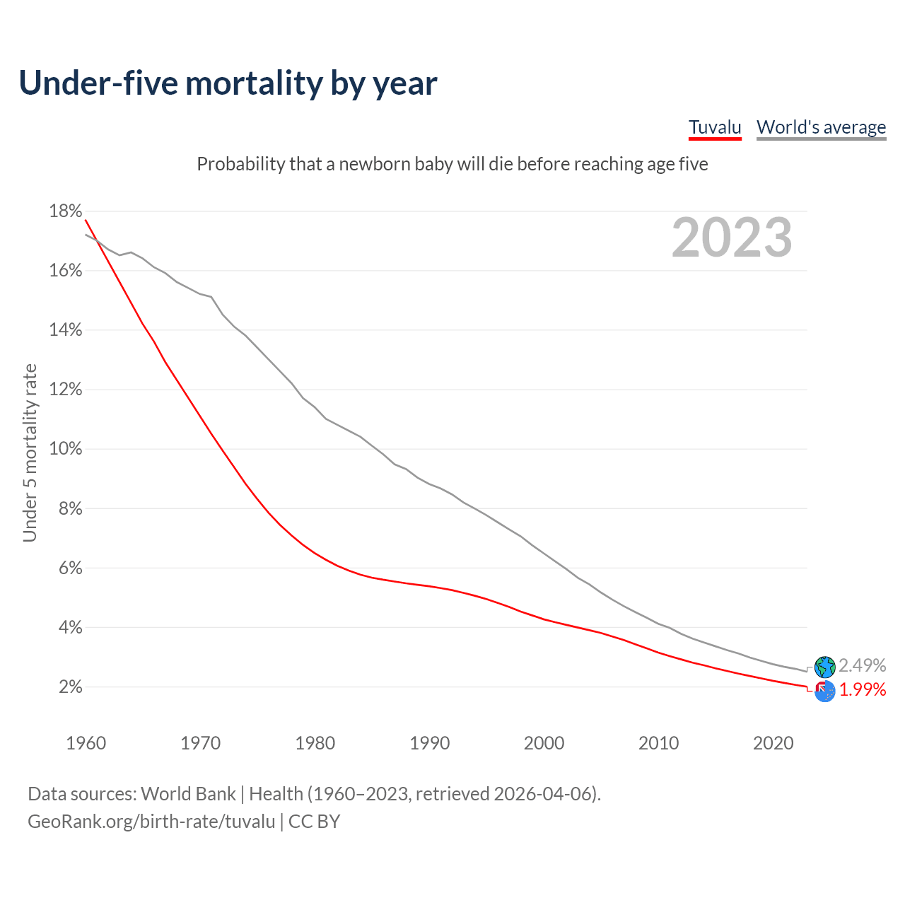 The under-5 mortality rate in Tuvalu was 19.9 deaths per 1,000 live births in 2023 — a 1.99% chance that a newborn baby will die before reaching age five. This is down from 42.6 deaths per 1,000 live births in 2000.