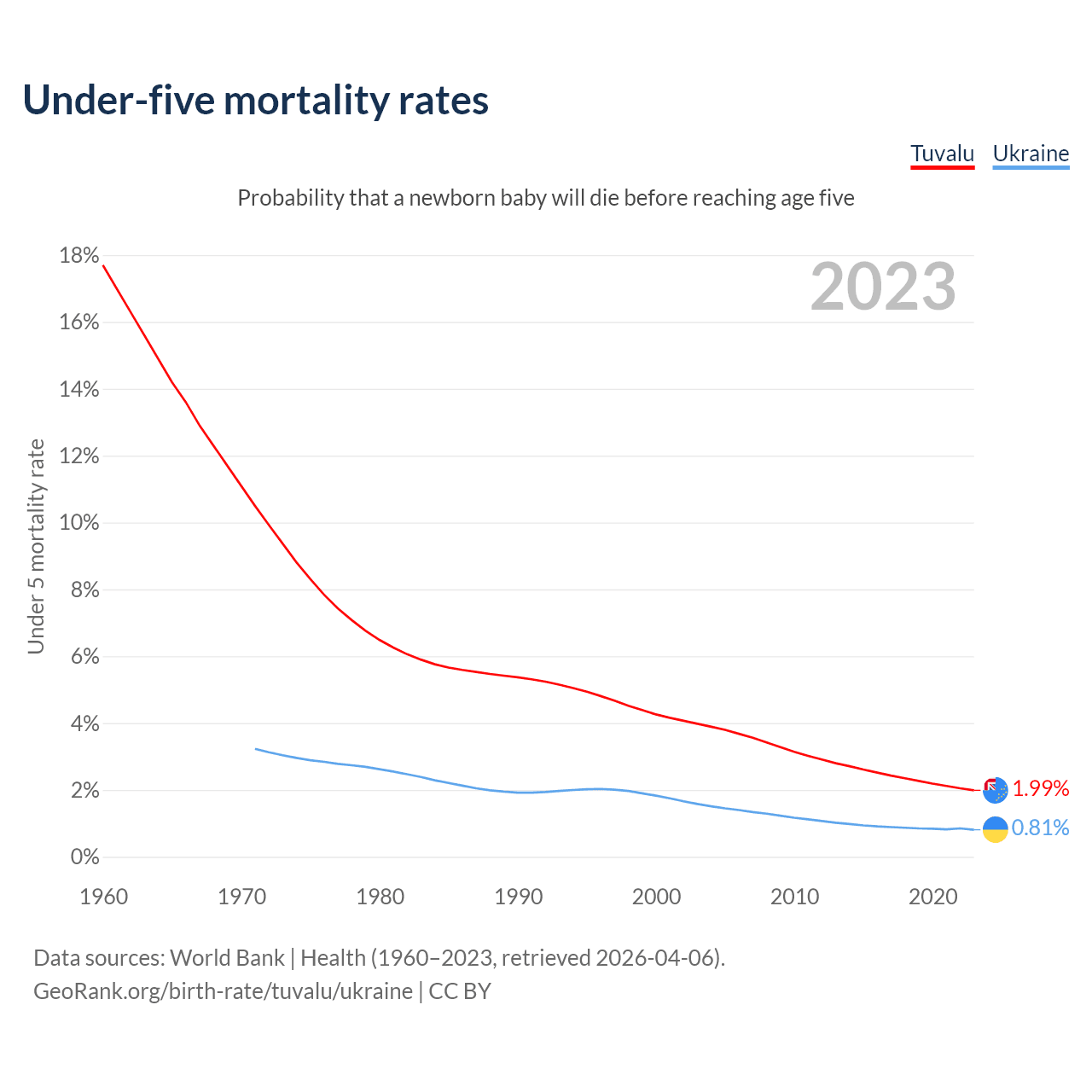 The chance that a newborn baby will die before reaching age five is 1.99% in Tuvalu and 0.81% in Ukraine. Above is a chart with historical data on under-five mortality rates.