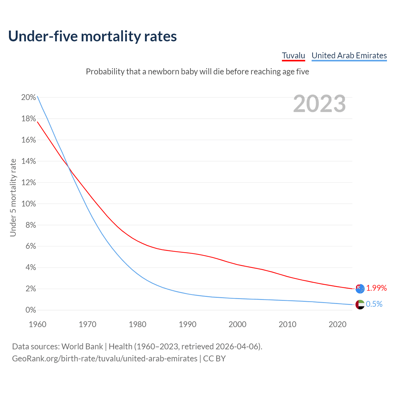 The chance that a newborn baby will die before reaching age five is 1.99% in Tuvalu and 0.5% in the United Arab Emirates. Above is a chart with historical data on under-five mortality rates.