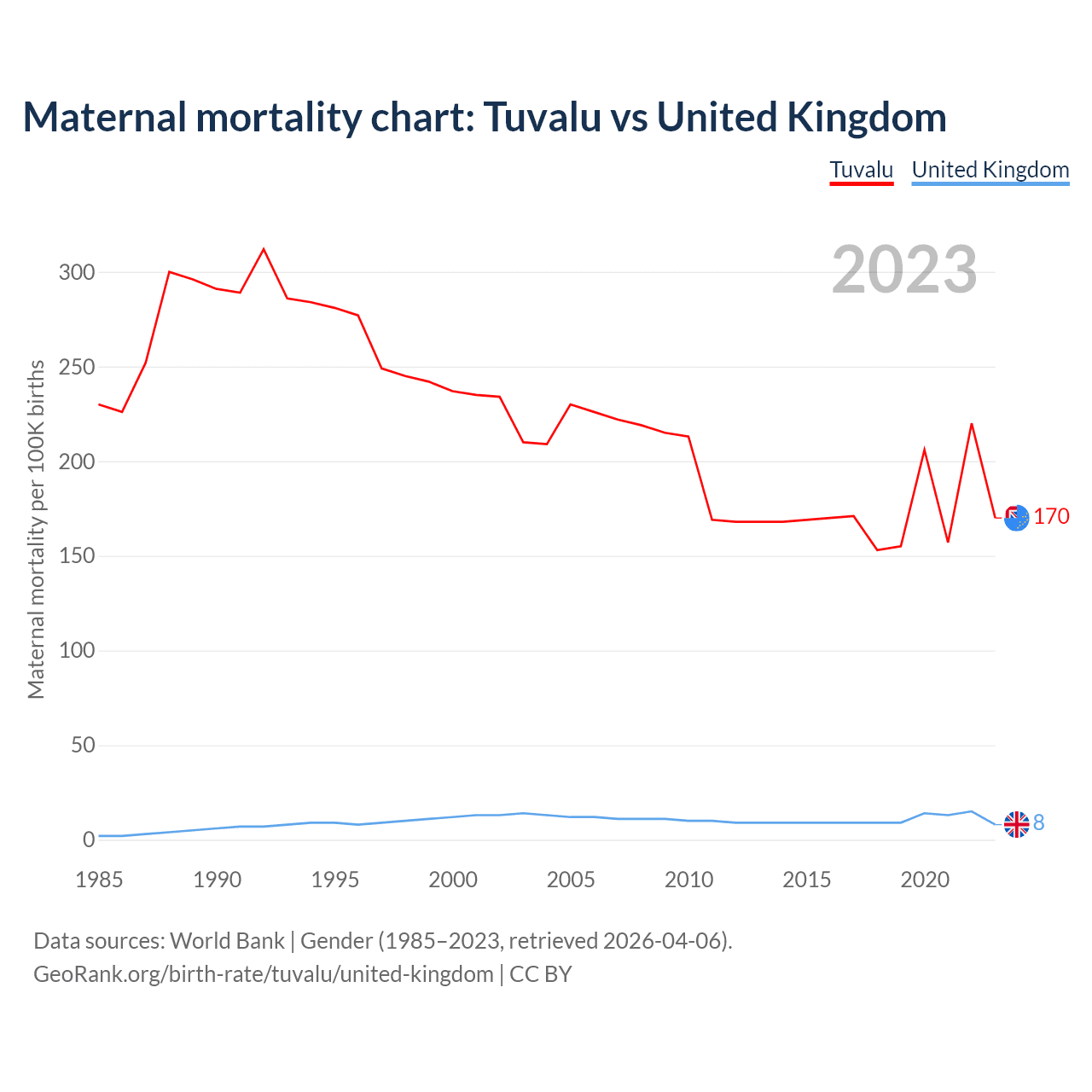 The maternal mortality rate, which is the probability of dying during childbirth or within 42 days of pregnancy termination, is 170 deaths per 100,000 live births in Tuvalu, compared to 8 deaths in the United Kingdom.