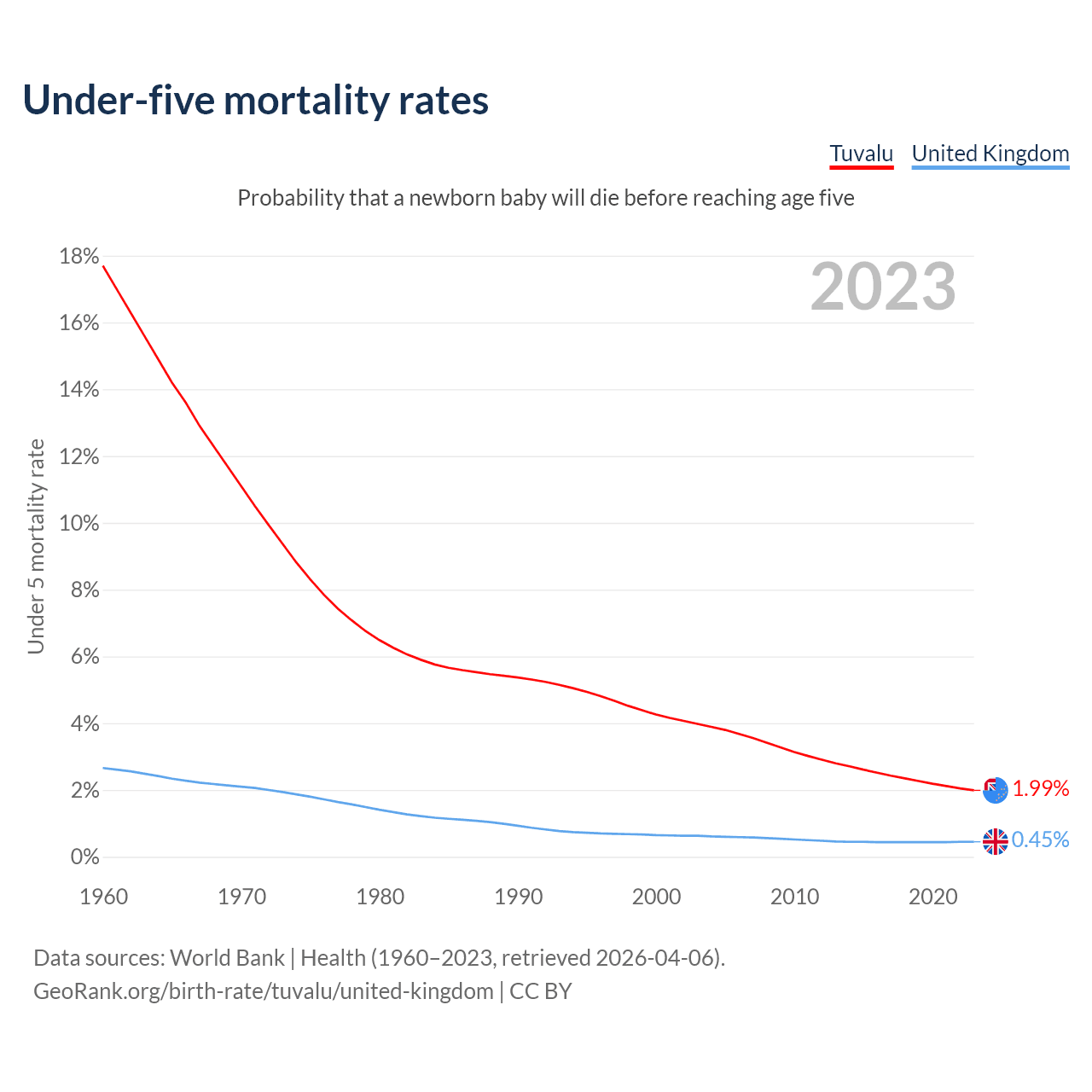 The chance that a newborn baby will die before reaching age five is 1.99% in Tuvalu and 0.45% in the United Kingdom. Above is a chart with historical data on under-five mortality rates.