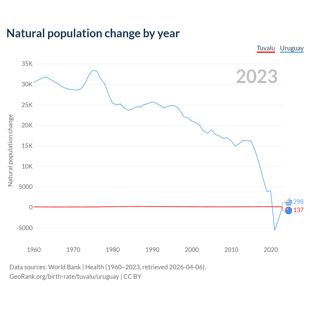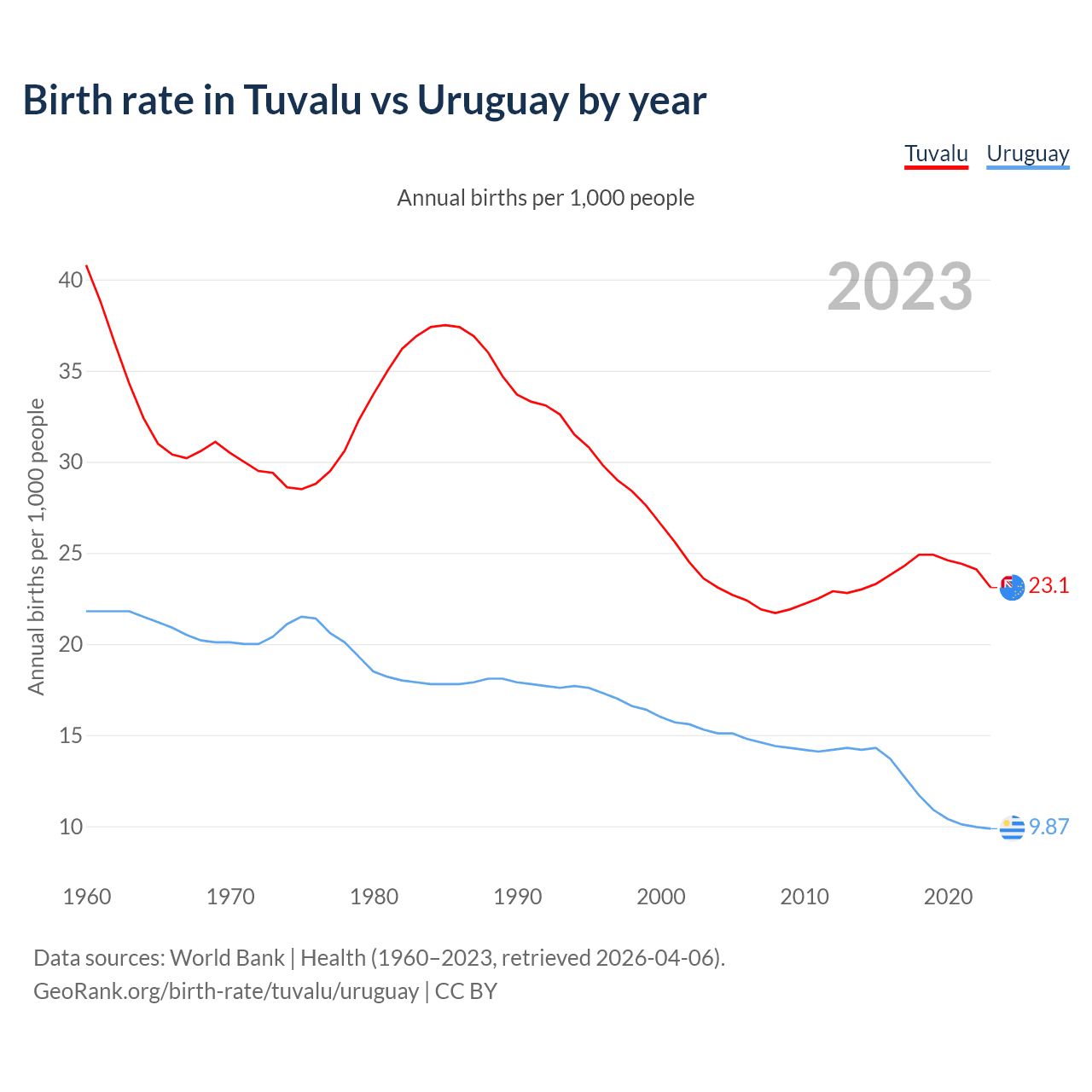 Tuvalu has an annual birth rate of 23.1 births per 1,000 people, compared to 9.87 for Uruguay. The average number of children a woman is expected to have during her lifetime — the fertility rate, is 3.21 in Tuvalu and 1.41 in Uruguay — 56.1% difference.