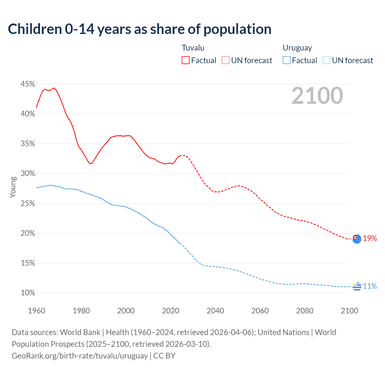 According to the latest available data on birth rates, the fertility rate in Tuvalu was 3.21 children per woman in 2023, compared to 1.41 in Uruguay in 2023. The replacement level is considered to be 2.1 children per woman.