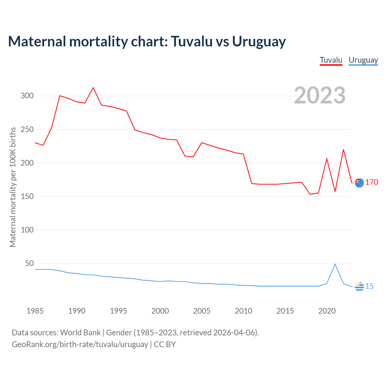 The maternal mortality rate, which is the probability of dying during childbirth or within 42 days of pregnancy termination, is 170 deaths per 100,000 live births in Tuvalu, compared to 15 deaths in Uruguay.
