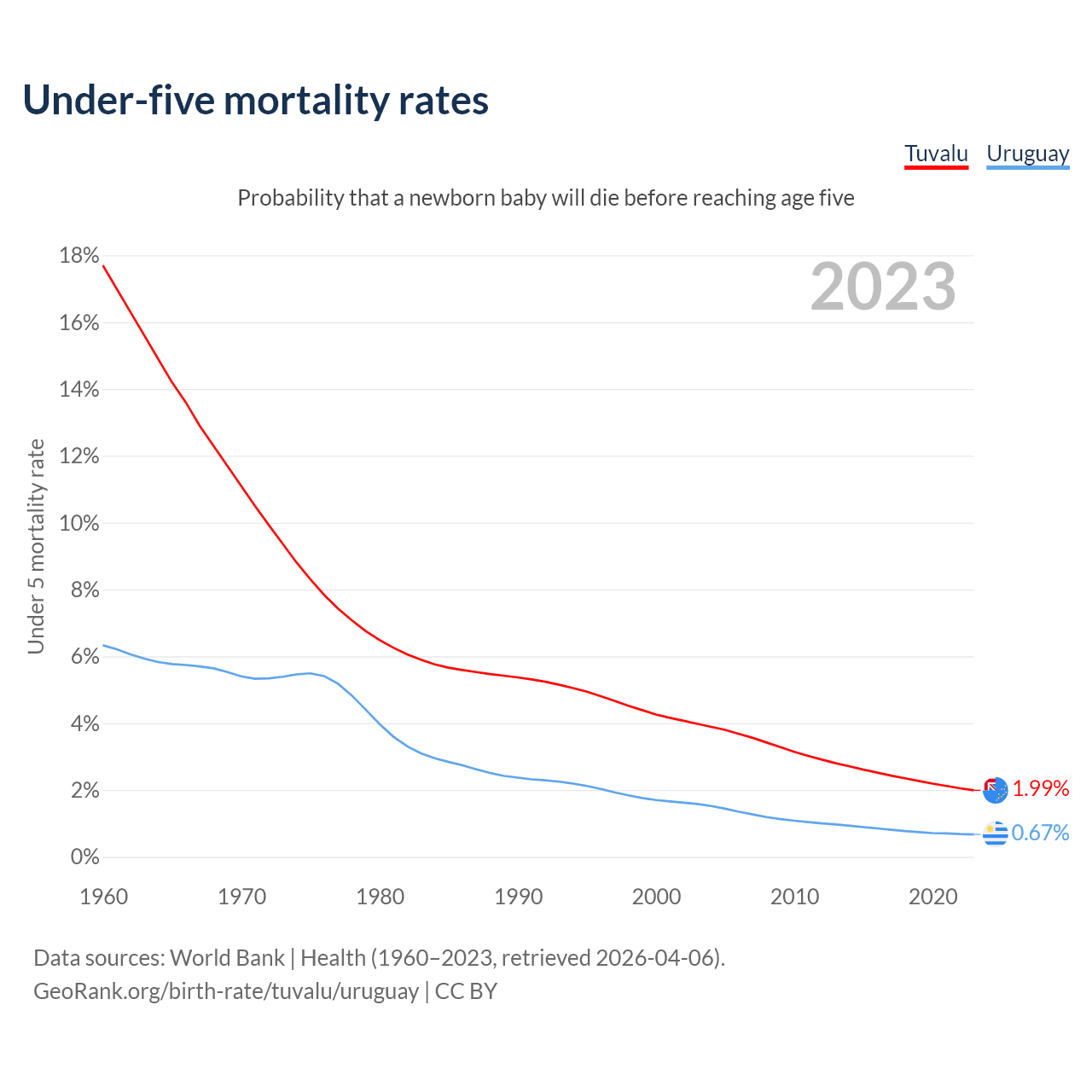 The chance that a newborn baby will die before reaching age five is 1.99% in Tuvalu and 0.67% in Uruguay. Above is a chart with historical data on under-five mortality rates.