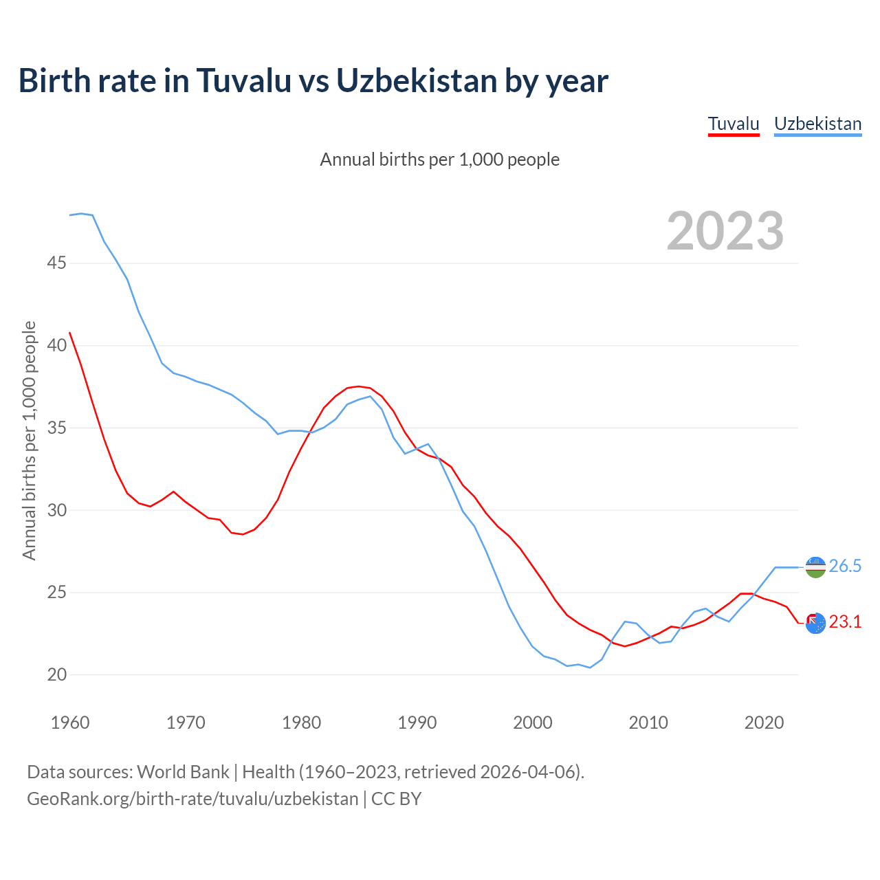 Tuvalu has an annual birth rate of 23.1 births per 1,000 people, compared to 26.5 for Uzbekistan. The average number of children a woman is expected to have during her lifetime — the fertility rate, is 3.21 in Tuvalu and 3.5 in Uzbekistan — 9.1% difference.