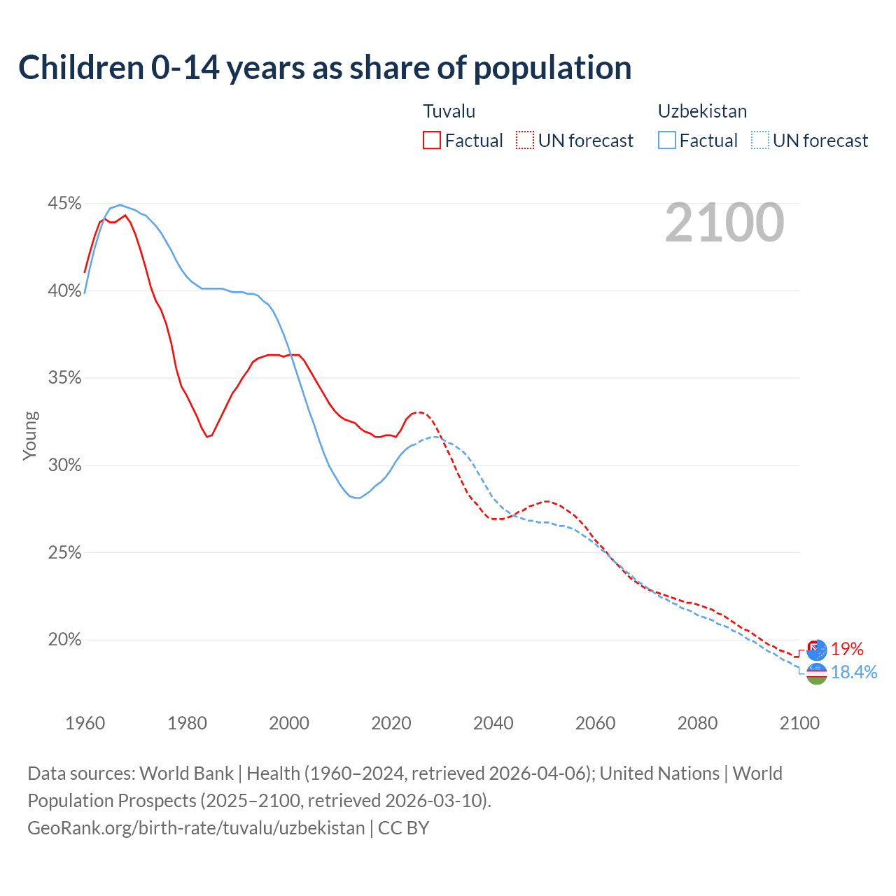 According to the latest available data on birth rates, the fertility rate in Tuvalu was 3.21 children per woman in 2023, compared to 3.5 in Uzbekistan in 2023. The replacement level is considered to be 2.1 children per woman.