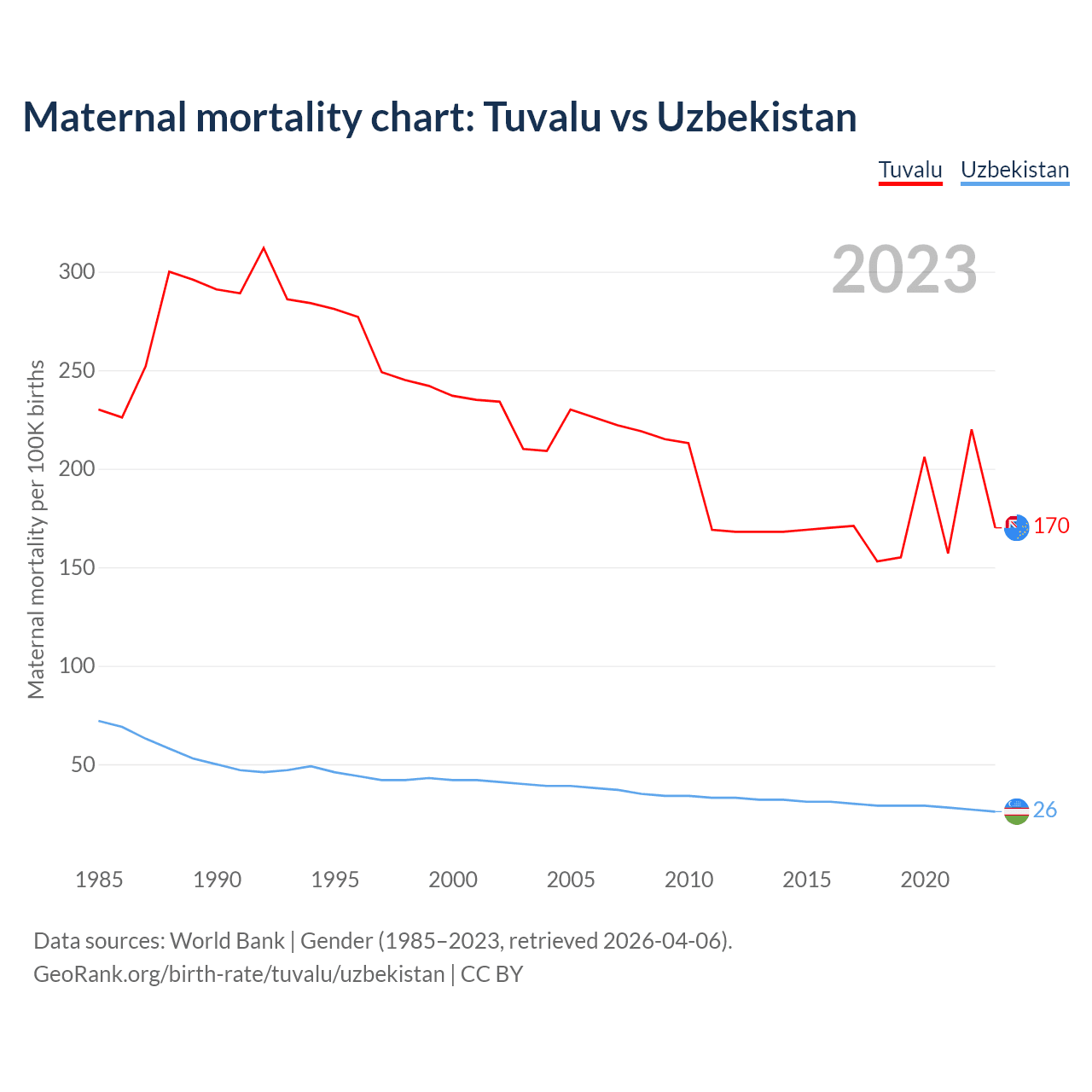 The maternal mortality rate, which is the probability of dying during childbirth or within 42 days of pregnancy termination, is 170 deaths per 100,000 live births in Tuvalu, compared to 26 deaths in Uzbekistan.
