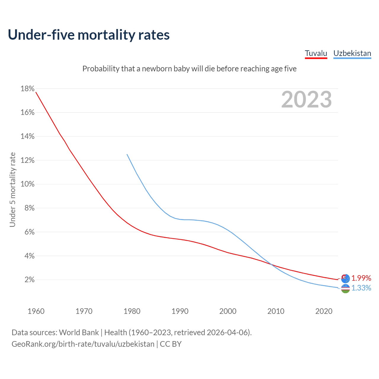 The chance that a newborn baby will die before reaching age five is 1.99% in Tuvalu and 1.33% in Uzbekistan. Above is a chart with historical data on under-five mortality rates.