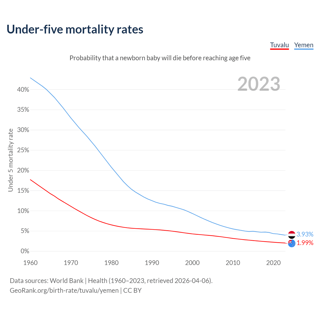 The chance that a newborn baby will die before reaching age five is 1.99% in Tuvalu and 3.93% in Yemen. Above is a chart with historical data on under-five mortality rates.