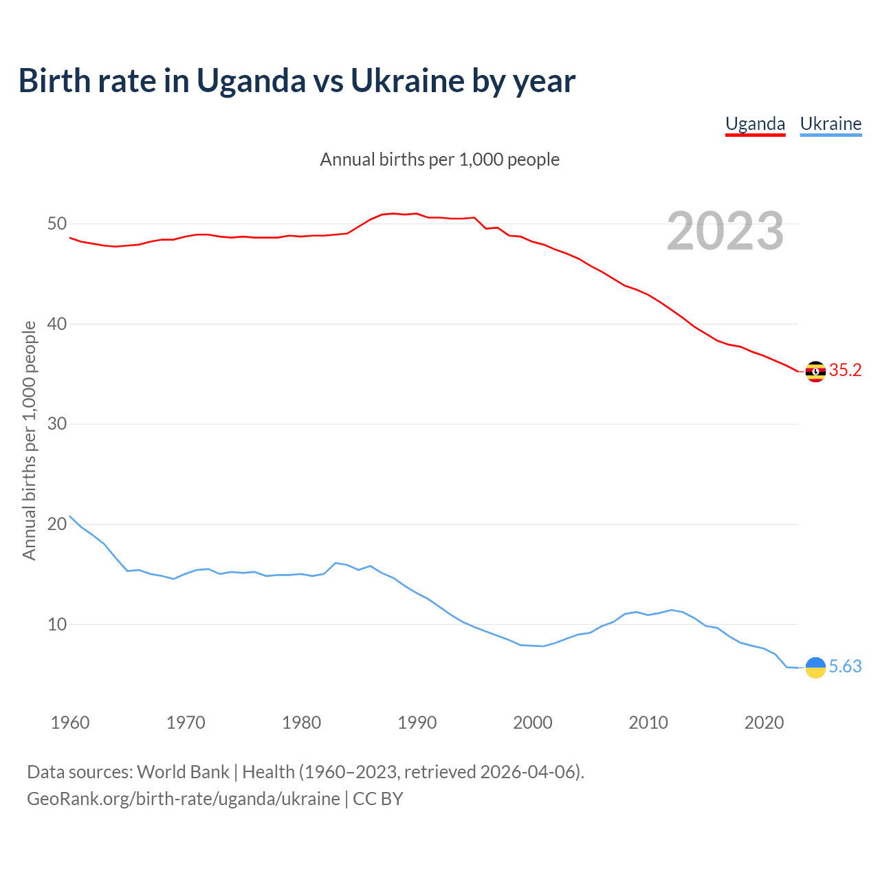Uganda has an annual birth rate of 35.2 births per 1,000 people, compared to 5.63 for Ukraine. The average number of children a woman is expected to have during her lifetime — the fertility rate, is 4.28 in Uganda and 0.98 in Ukraine — 77.2% difference.