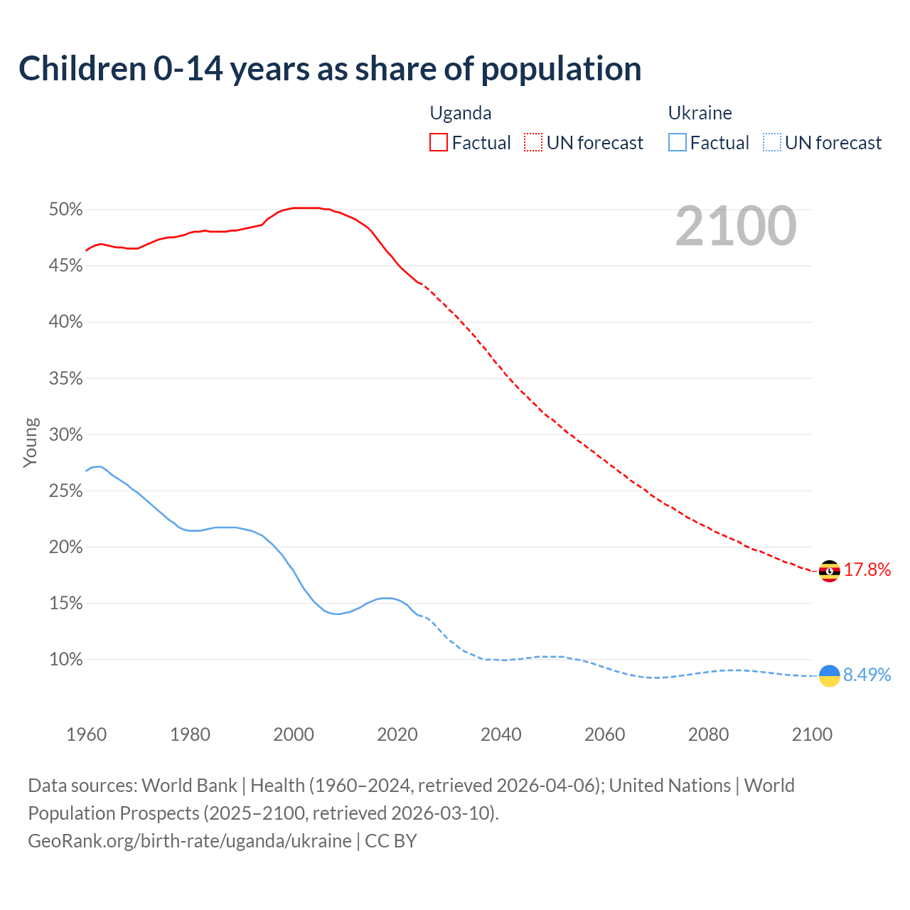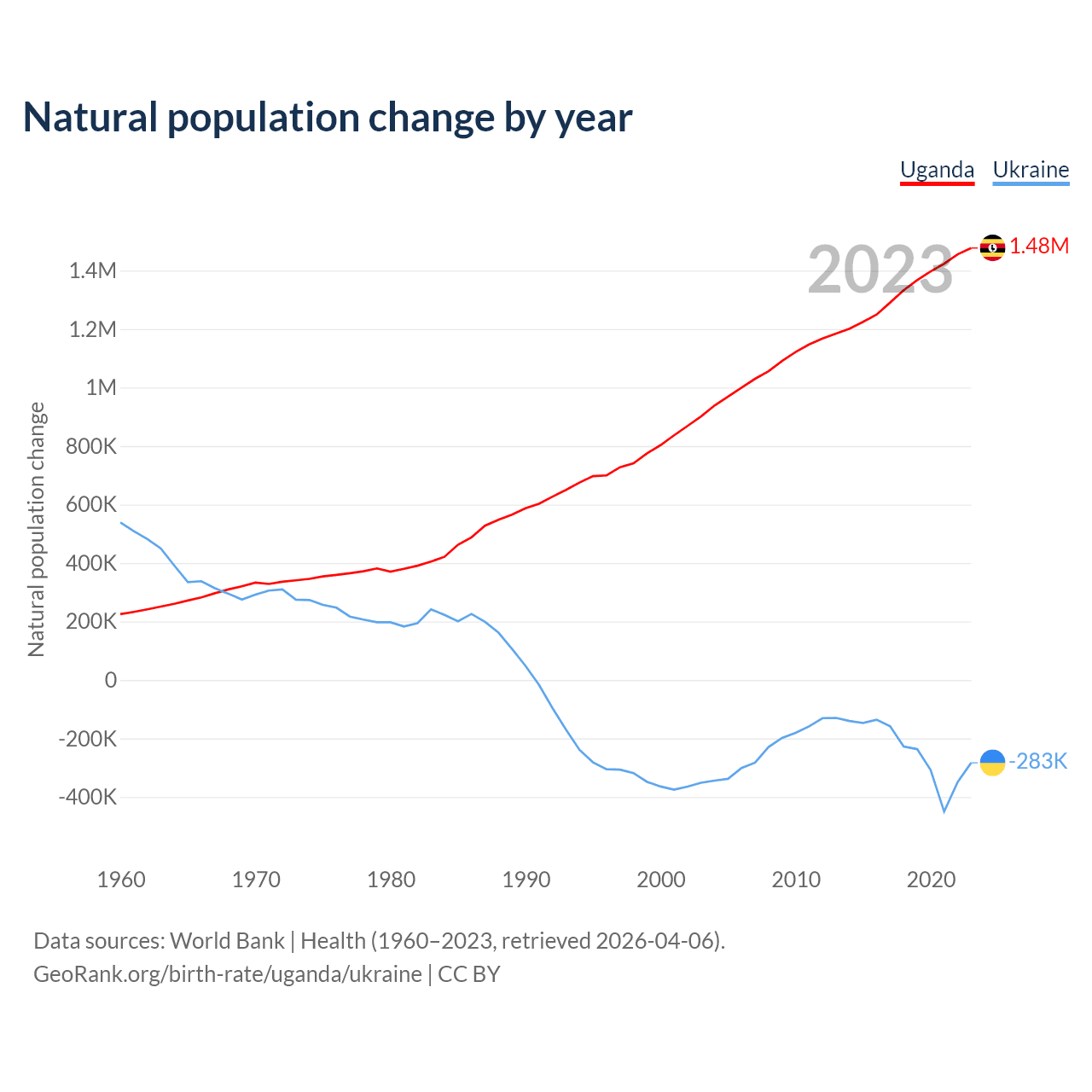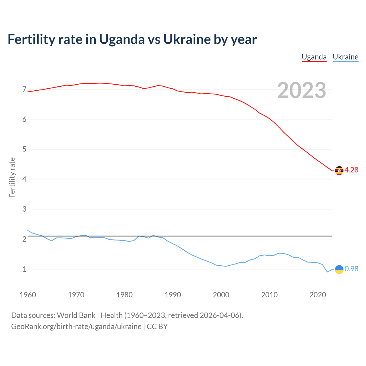 According to the latest available data on birth rates, the fertility rate in Uganda was 4.28 children per woman in 2023, compared to 0.98 in Ukraine in 2023. The replacement level is considered to be 2.1 children per woman.