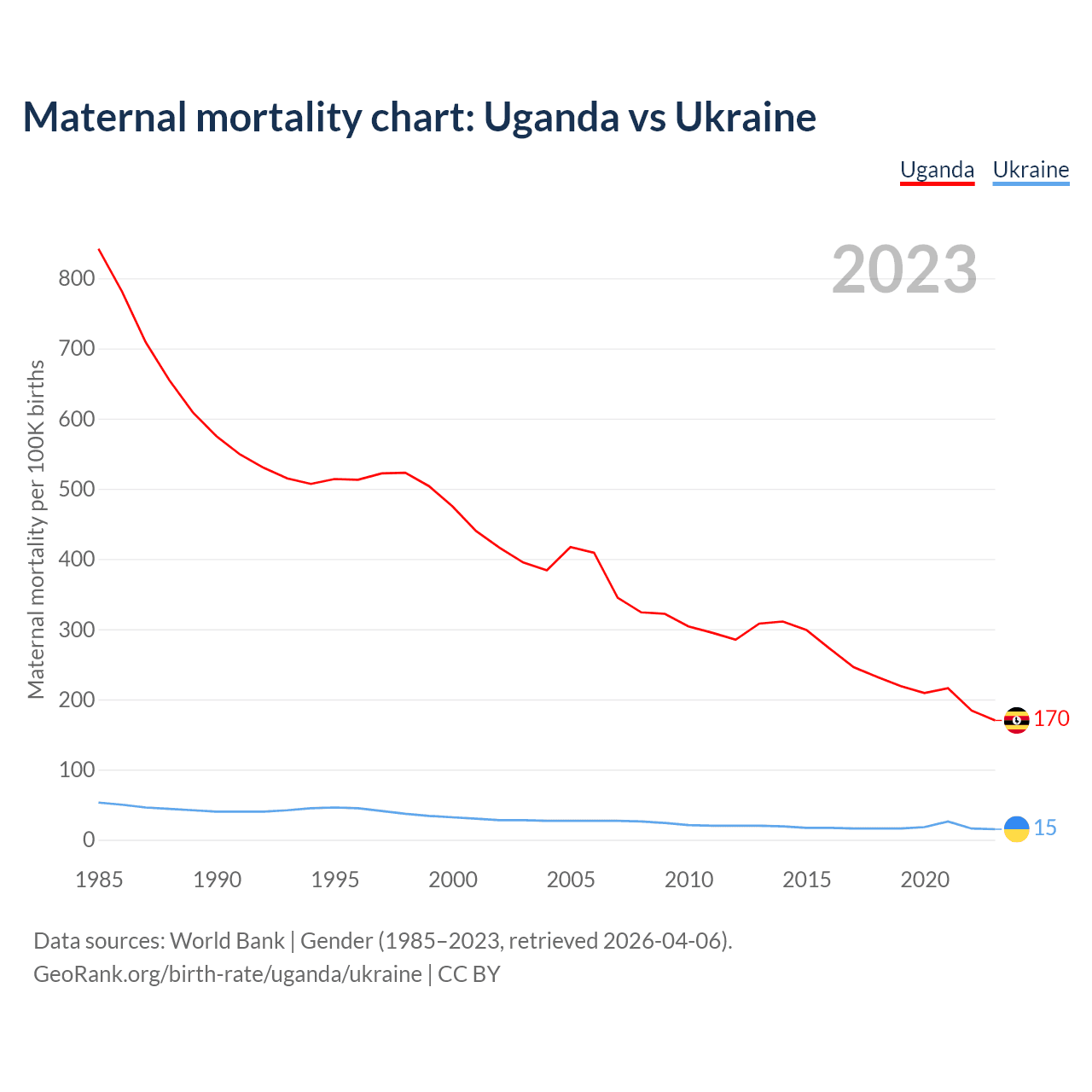 The maternal mortality rate, which is the probability of dying during childbirth or within 42 days of pregnancy termination, is 170 deaths per 100,000 live births in Uganda, compared to 15 deaths in Ukraine.