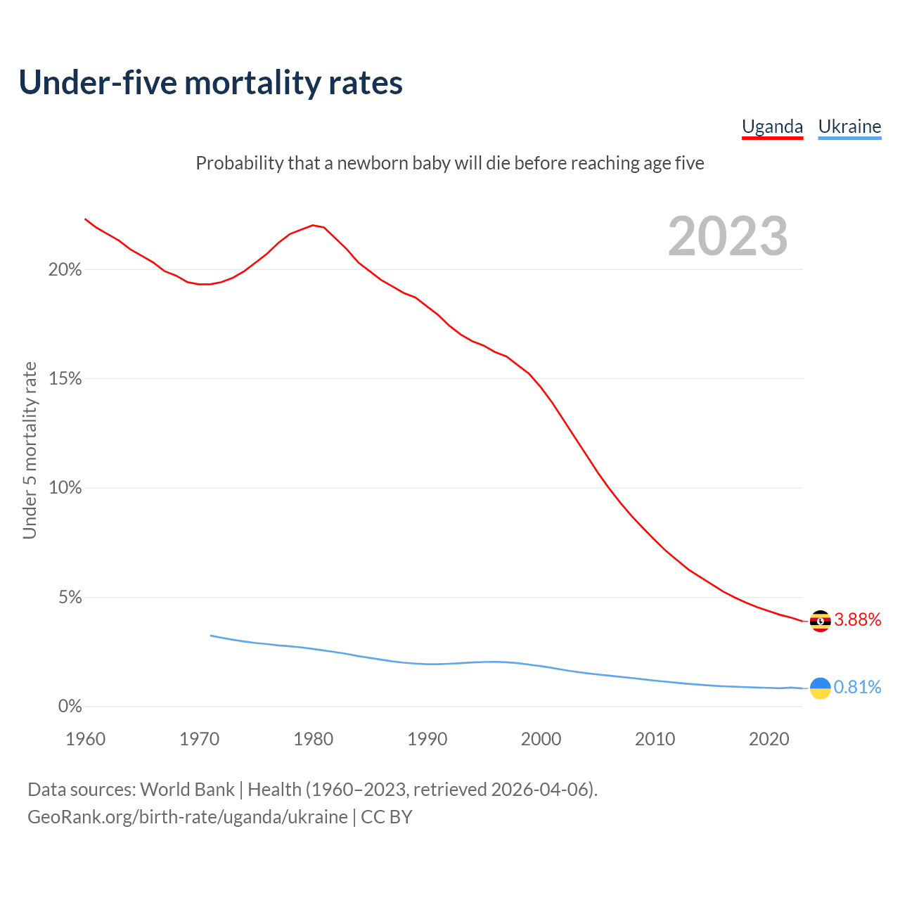 The chance that a newborn baby will die before reaching age five is 3.88% in Uganda and 0.81% in Ukraine. Above is a chart with historical data on under-five mortality rates.