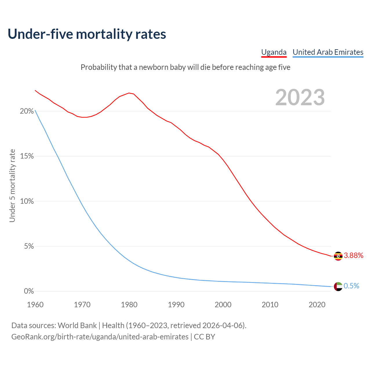 The chance that a newborn baby will die before reaching age five is 3.88% in Uganda and 0.5% in the United Arab Emirates. Above is a chart with historical data on under-five mortality rates.