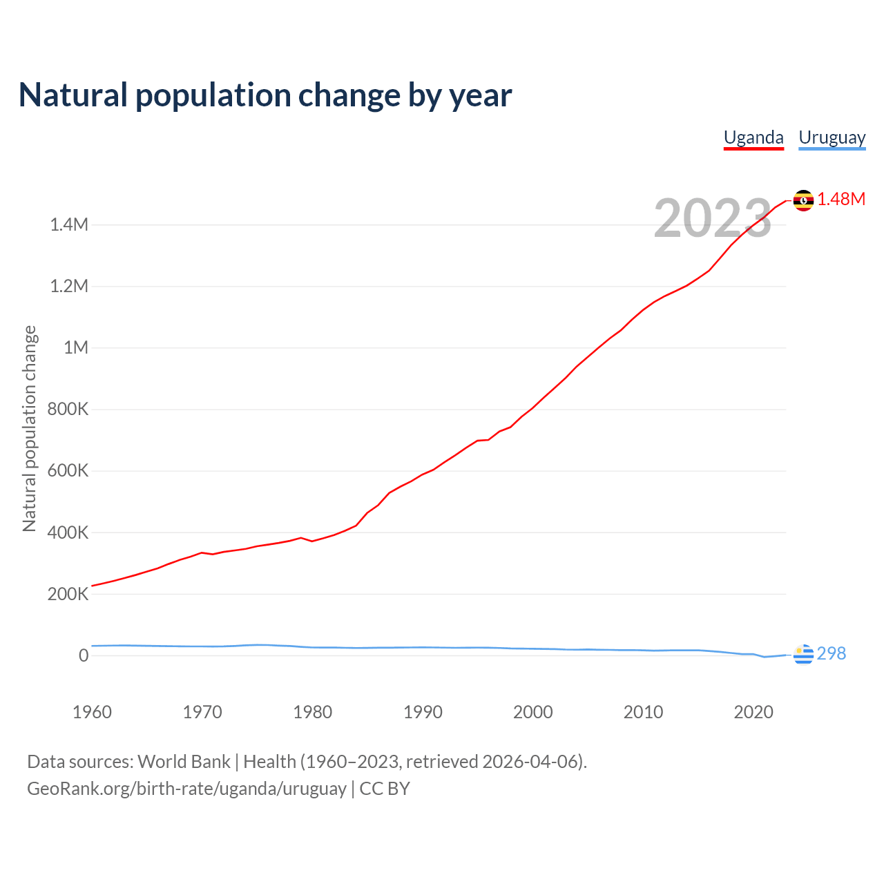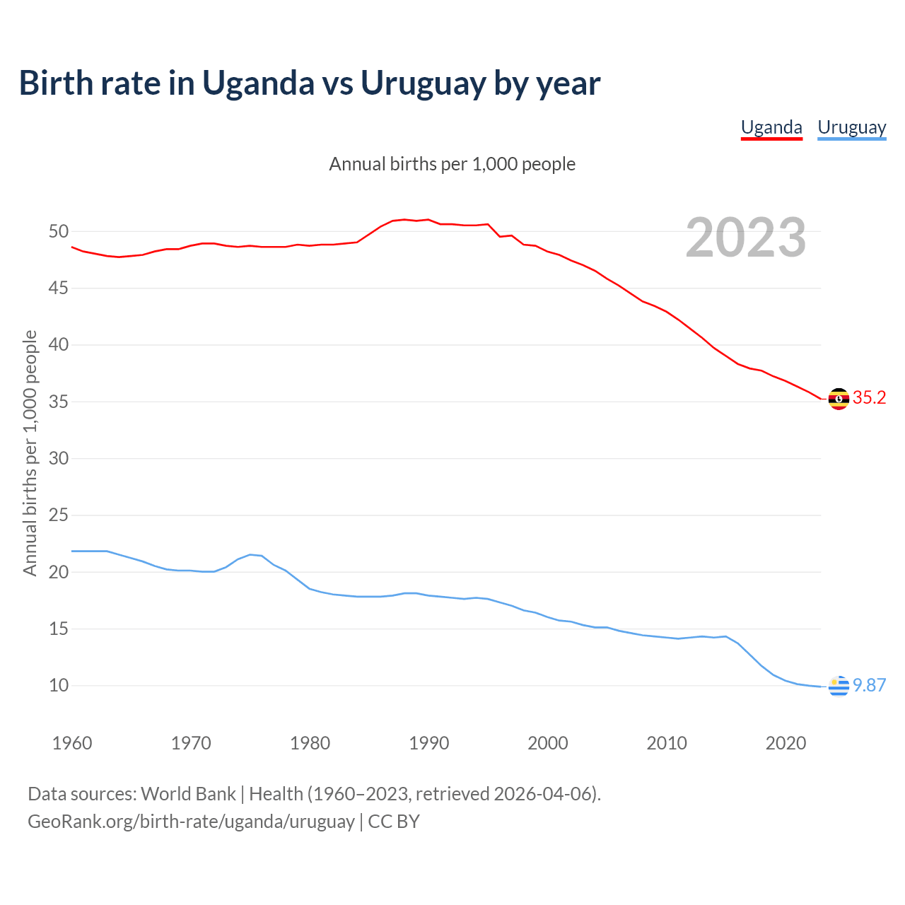 Uganda has an annual birth rate of 35.2 births per 1,000 people, compared to 9.87 for Uruguay. The average number of children a woman is expected to have during her lifetime — the fertility rate, is 4.28 in Uganda and 1.41 in Uruguay — 67.1% difference.
