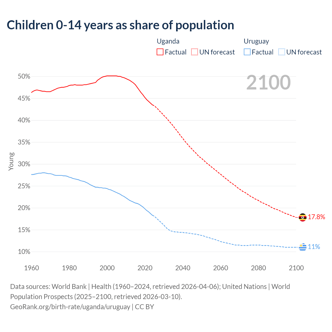 According to the latest available data on birth rates, the fertility rate in Uganda was 4.28 children per woman in 2023, compared to 1.41 in Uruguay in 2023. The replacement level is considered to be 2.1 children per woman.