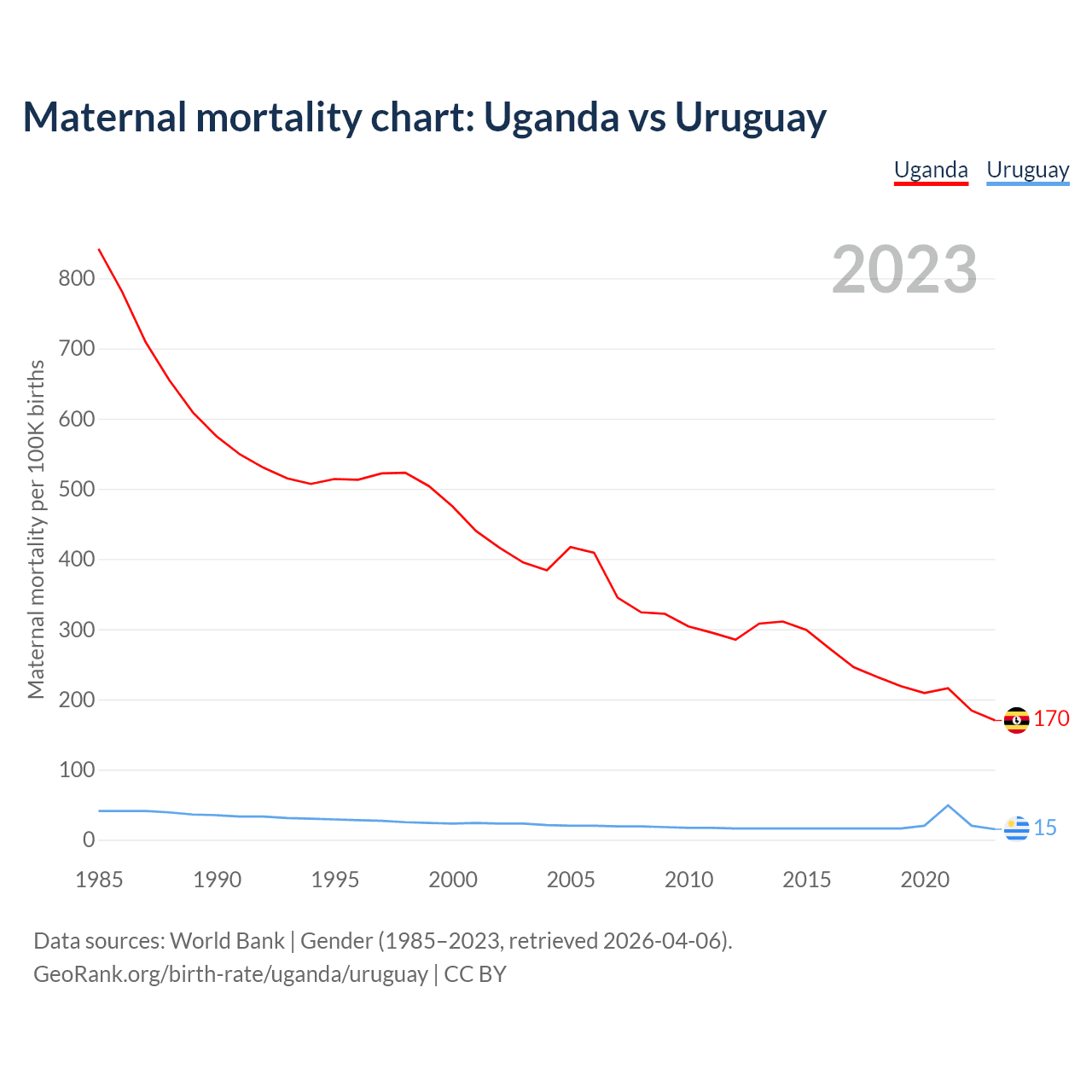 The maternal mortality rate, which is the probability of dying during childbirth or within 42 days of pregnancy termination, is 170 deaths per 100,000 live births in Uganda, compared to 15 deaths in Uruguay.