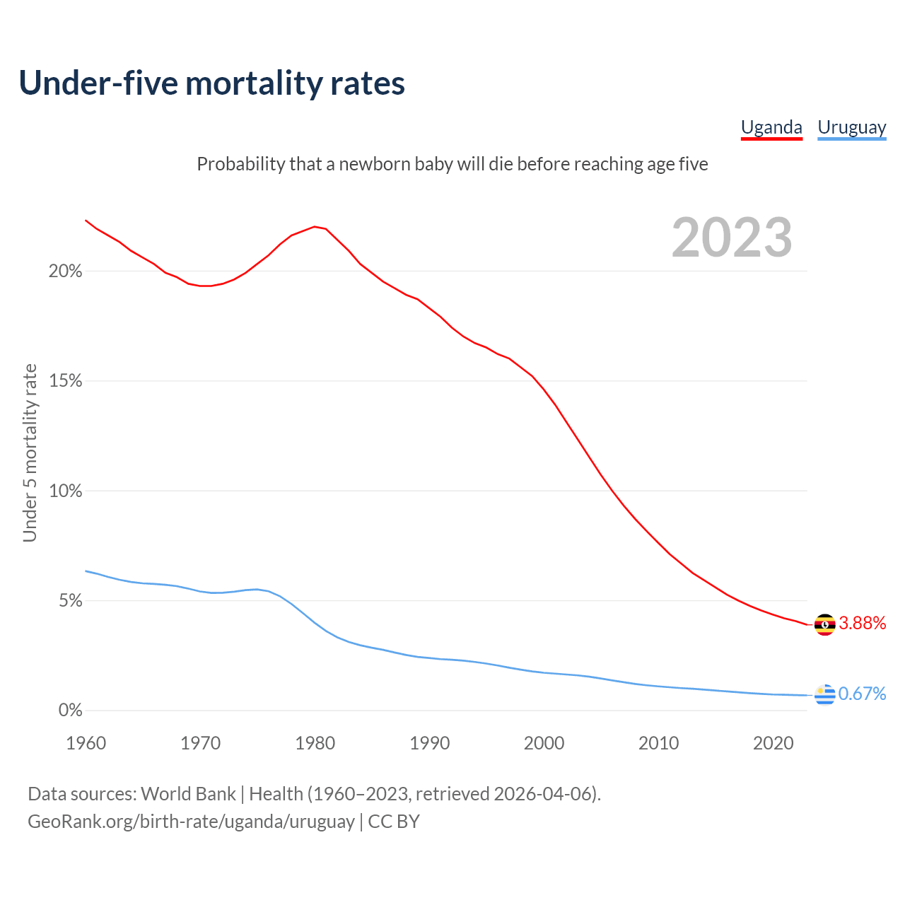 The chance that a newborn baby will die before reaching age five is 3.88% in Uganda and 0.67% in Uruguay. Above is a chart with historical data on under-five mortality rates.