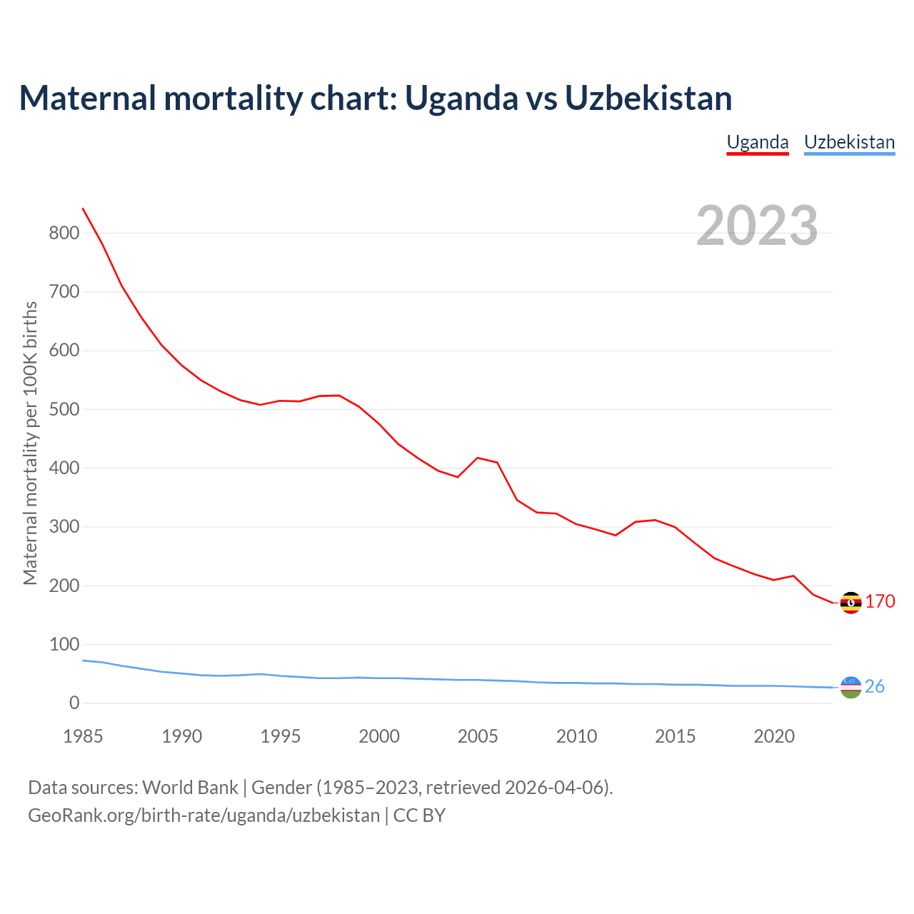 The maternal mortality rate, which is the probability of dying during childbirth or within 42 days of pregnancy termination, is 170 deaths per 100,000 live births in Uganda, compared to 26 deaths in Uzbekistan.