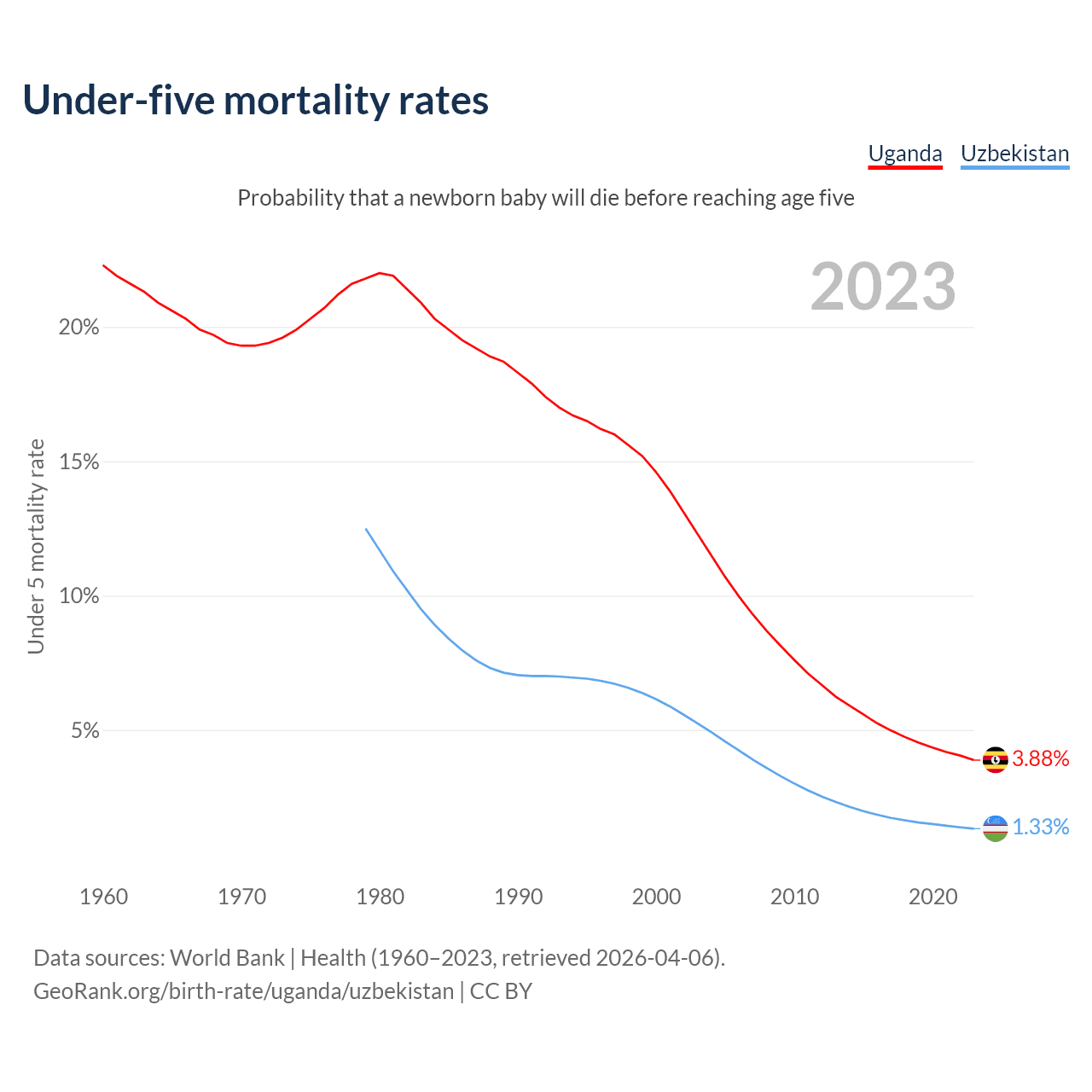 The chance that a newborn baby will die before reaching age five is 3.88% in Uganda and 1.33% in Uzbekistan. Above is a chart with historical data on under-five mortality rates.