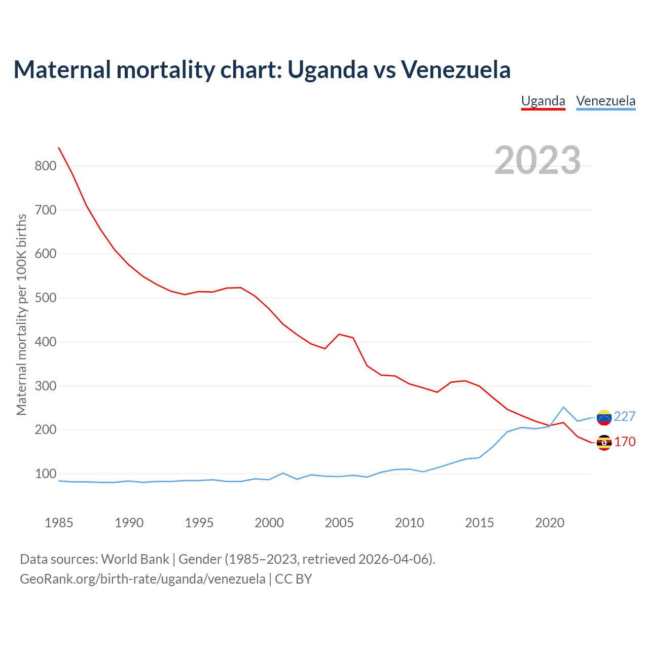 The maternal mortality rate, which is the probability of dying during childbirth or within 42 days of pregnancy termination, is 170 deaths per 100,000 live births in Uganda, compared to 227 deaths in Venezuela.
