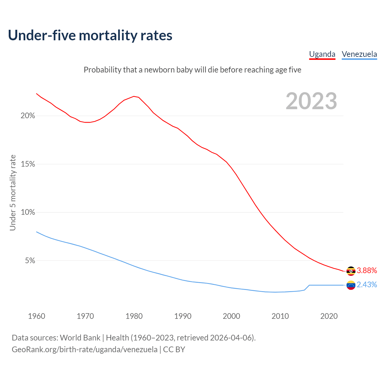 The chance that a newborn baby will die before reaching age five is 3.88% in Uganda and 2.43% in Venezuela. Above is a chart with historical data on under-five mortality rates.
