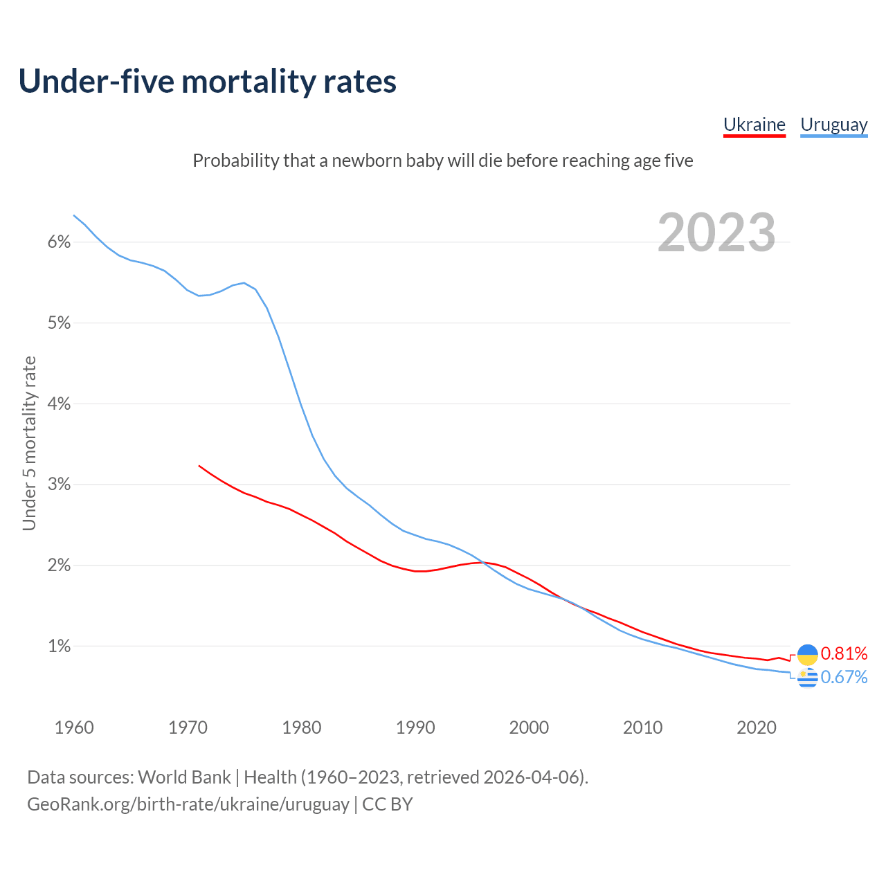 The chance that a newborn baby will die before reaching age five is 0.81% in Ukraine and 0.67% in Uruguay. Above is a chart with historical data on under-five mortality rates.