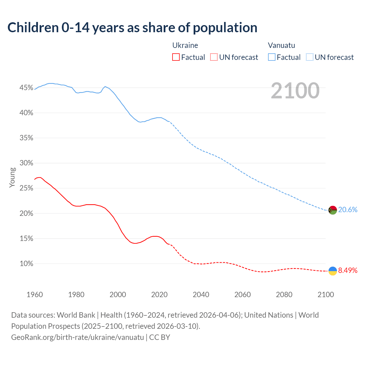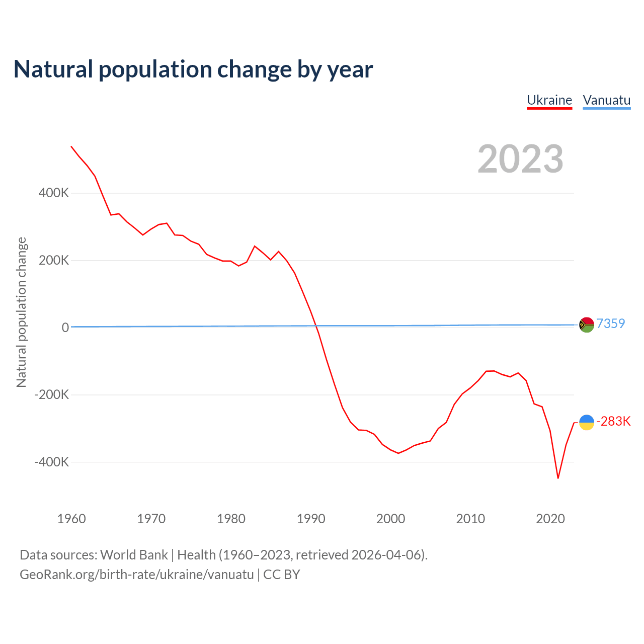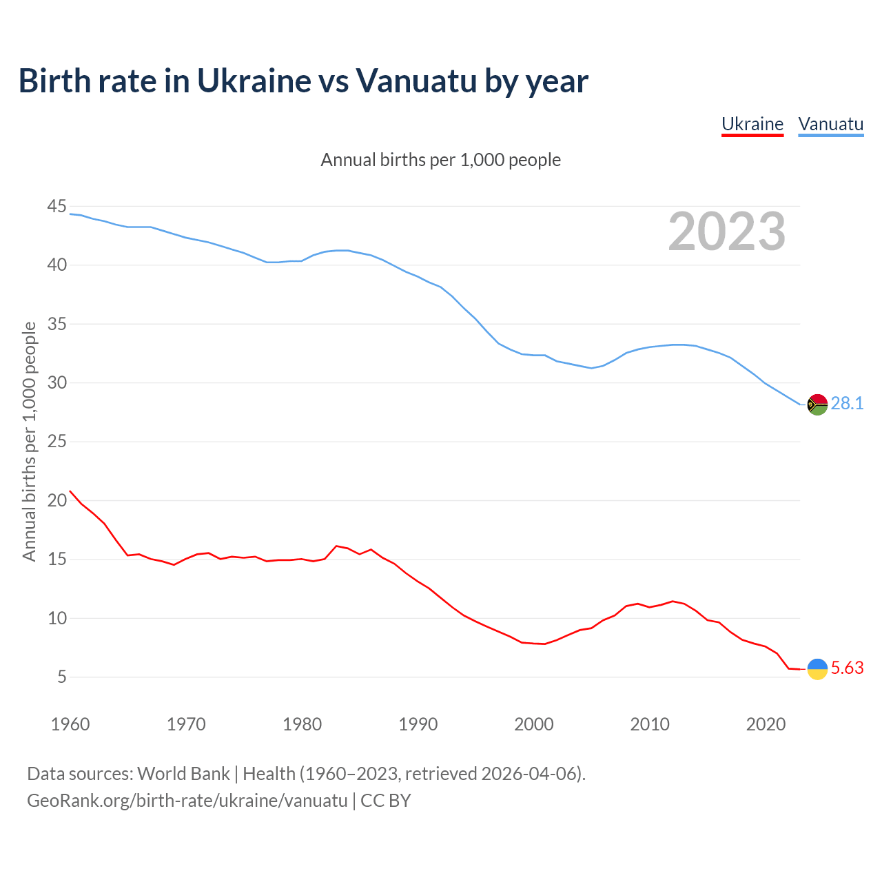 Ukraine has an annual birth rate of 5.63 births per 1,000 people, compared to 28.1 for Vanuatu. The average number of children a woman is expected to have during her lifetime — the fertility rate, is 0.98 in Ukraine and 3.6 in Vanuatu — 268.1% difference.