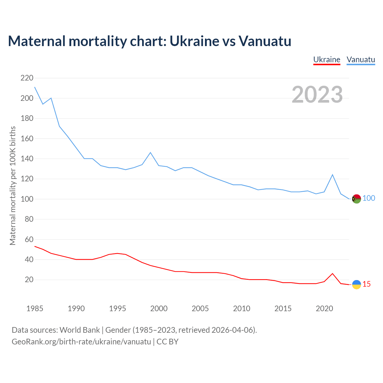 The maternal mortality rate, which is the probability of dying during childbirth or within 42 days of pregnancy termination, is 15 deaths per 100,000 live births in Ukraine, compared to 100 deaths in Vanuatu.