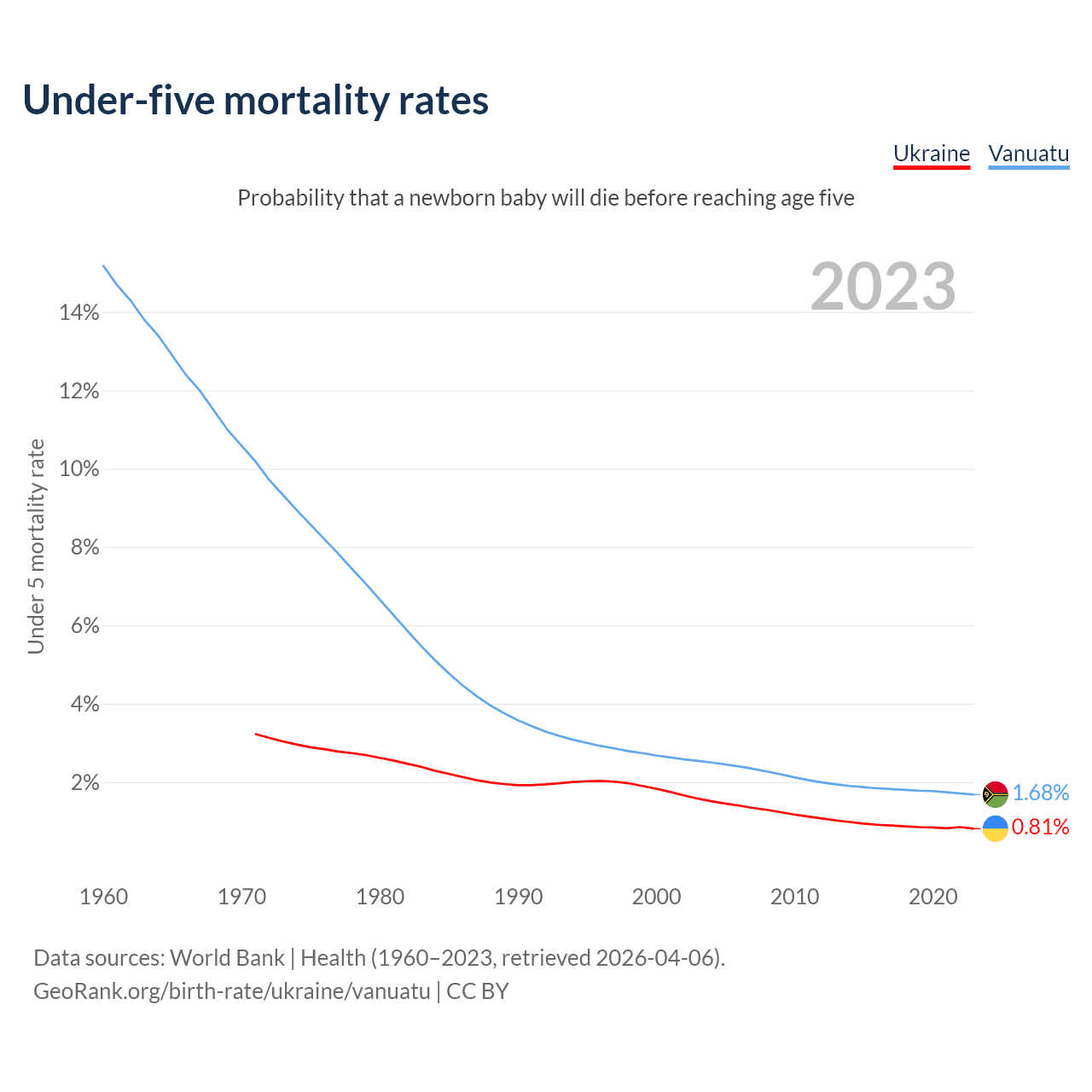 The chance that a newborn baby will die before reaching age five is 0.81% in Ukraine and 1.68% in Vanuatu. Above is a chart with historical data on under-five mortality rates.
