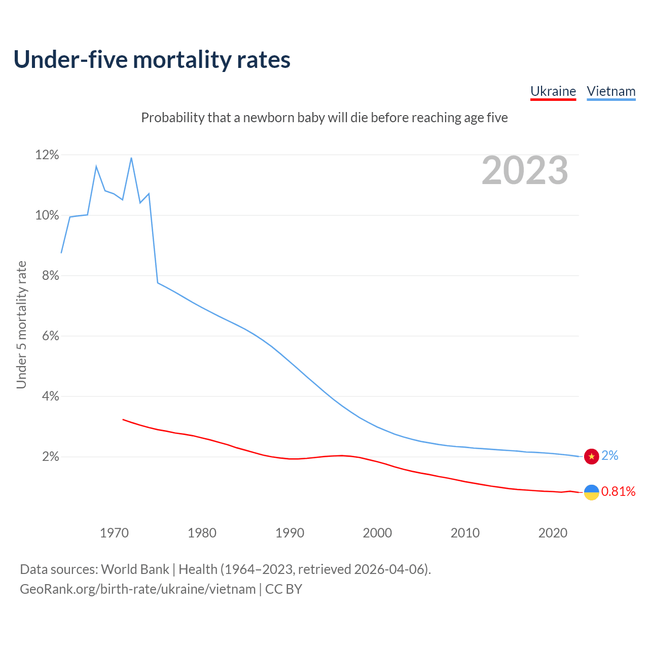 The chance that a newborn baby will die before reaching age five is 0.81% in Ukraine and 2% in Vietnam. Above is a chart with historical data on under-five mortality rates.