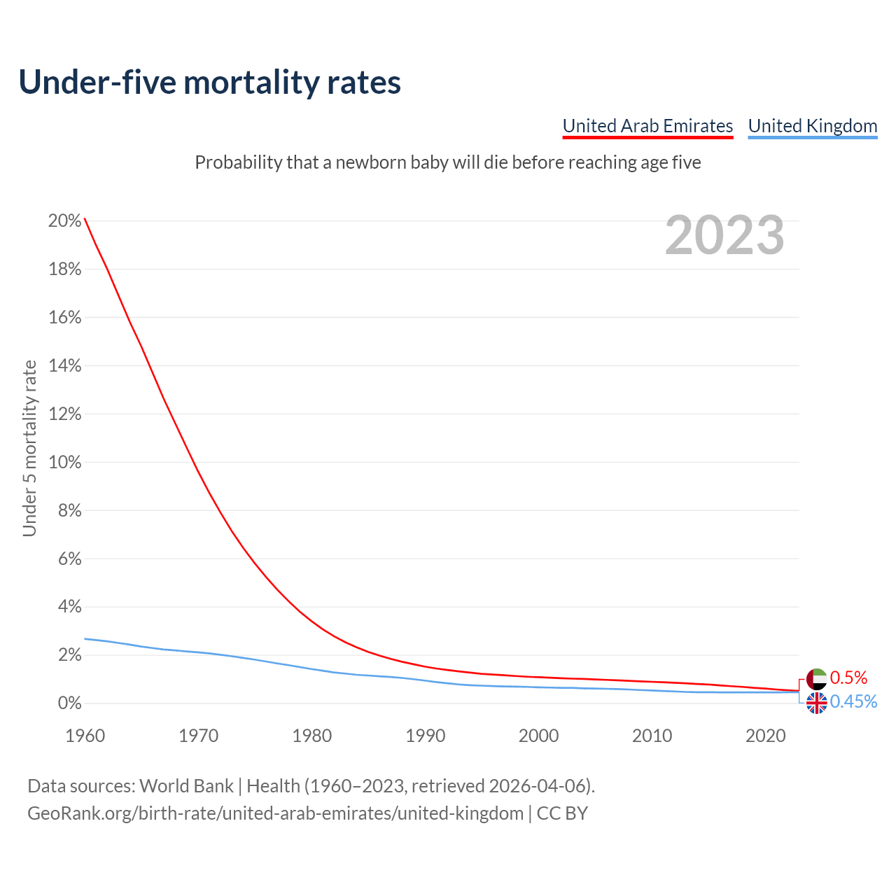 The chance that a newborn baby will die before reaching age five is 0.5% in the United Arab Emirates and 0.45% in the United Kingdom. Above is a chart with historical data on under-five mortality rates.