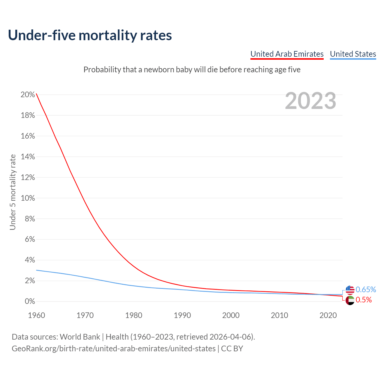 The chance that a newborn baby will die before reaching age five is 0.5% in the United Arab Emirates and 0.65% in the United States. Above is a chart with historical data on under-five mortality rates.