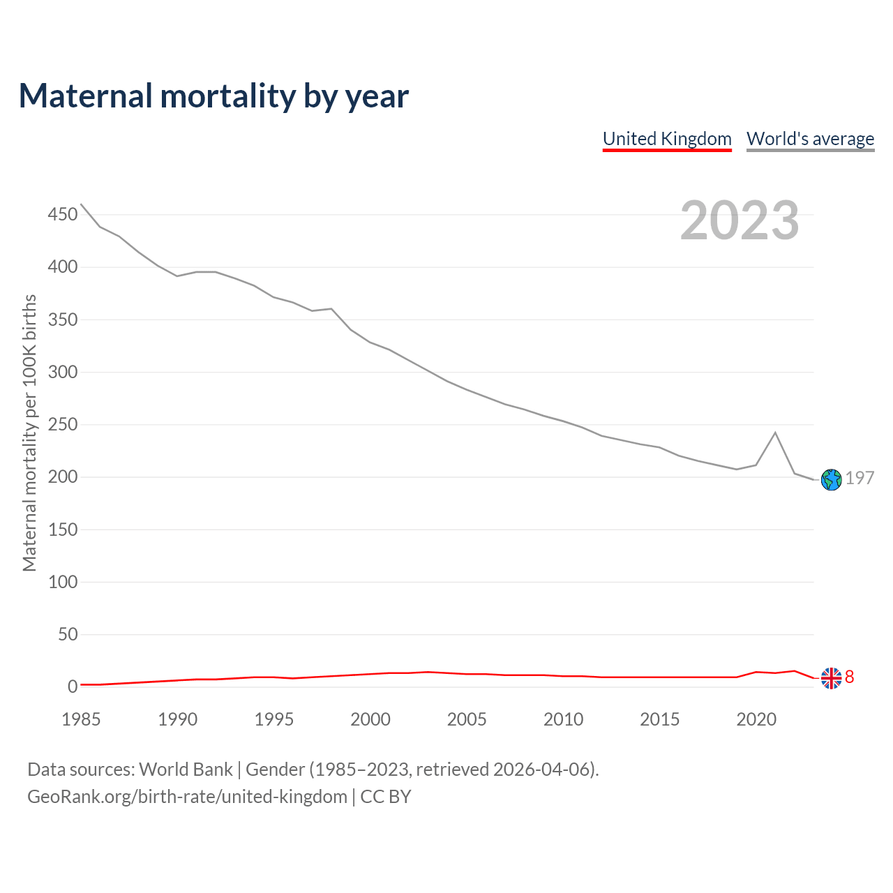 The maternal mortality rate in the United Kingdom was 8 deaths per 100,000 live births in 2023 — a 0.008% chance of dying during childbirth or within 42 days of pregnancy termination. This is a 33.3% decrease compared to the year 2000.
