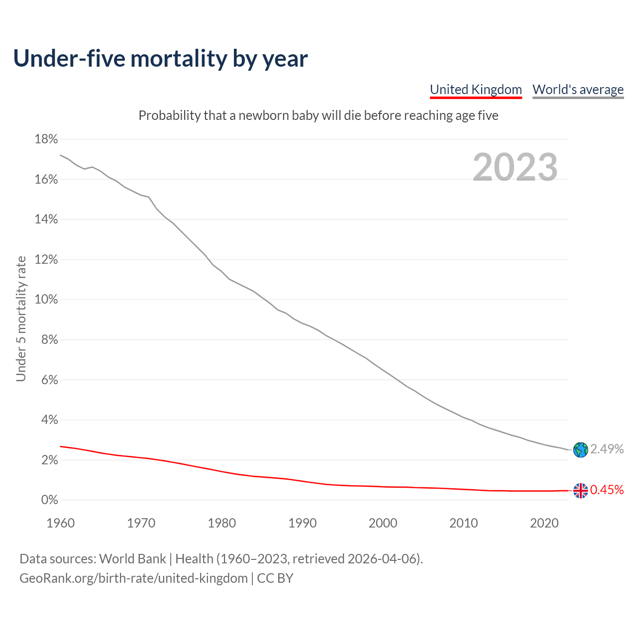 The under-5 mortality rate in the United Kingdom was 4.5 deaths per 1,000 live births in 2023 — a 0.45% chance that a newborn baby will die before reaching age five. This is down from 6.5 deaths per 1,000 live births in 2000.